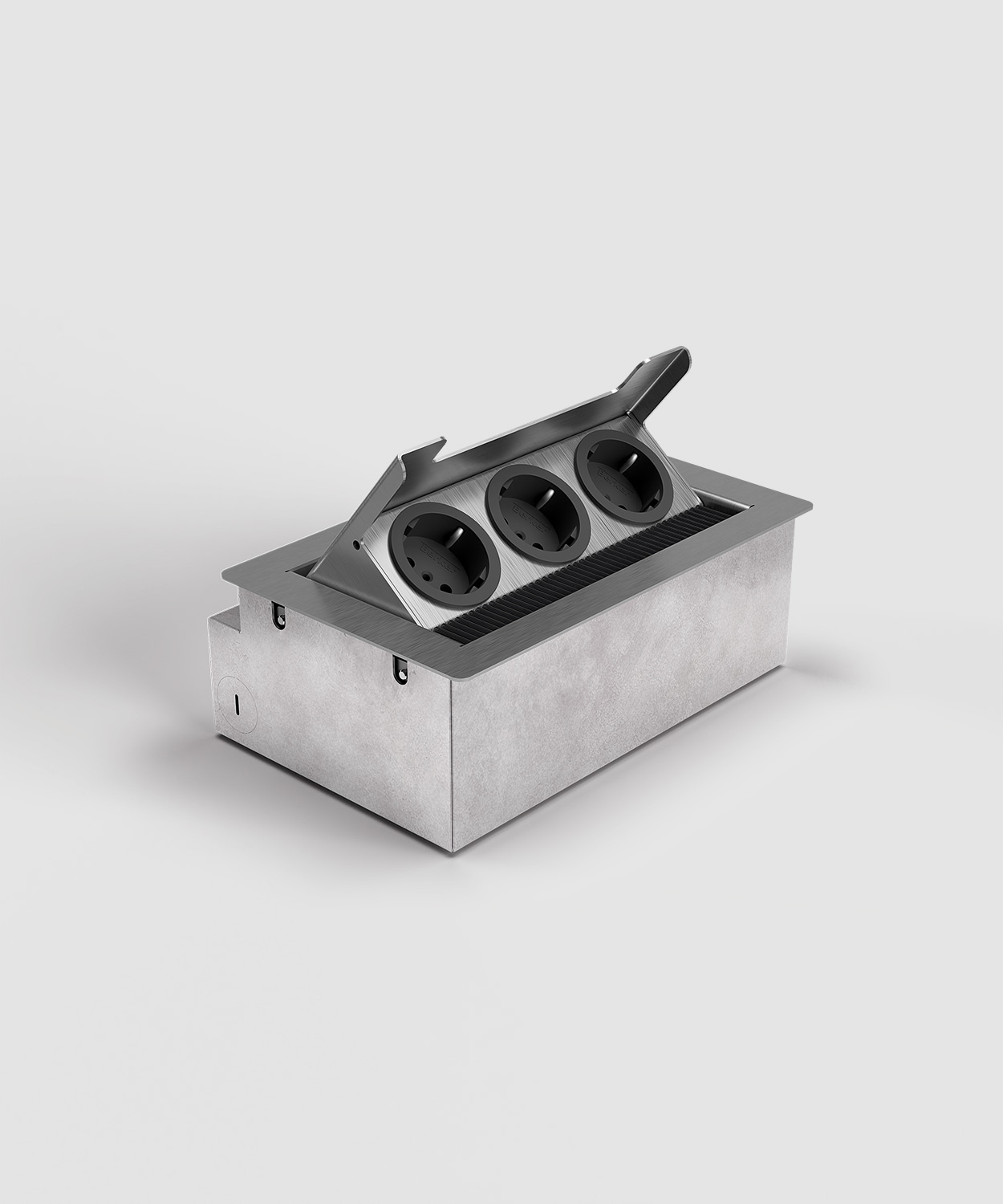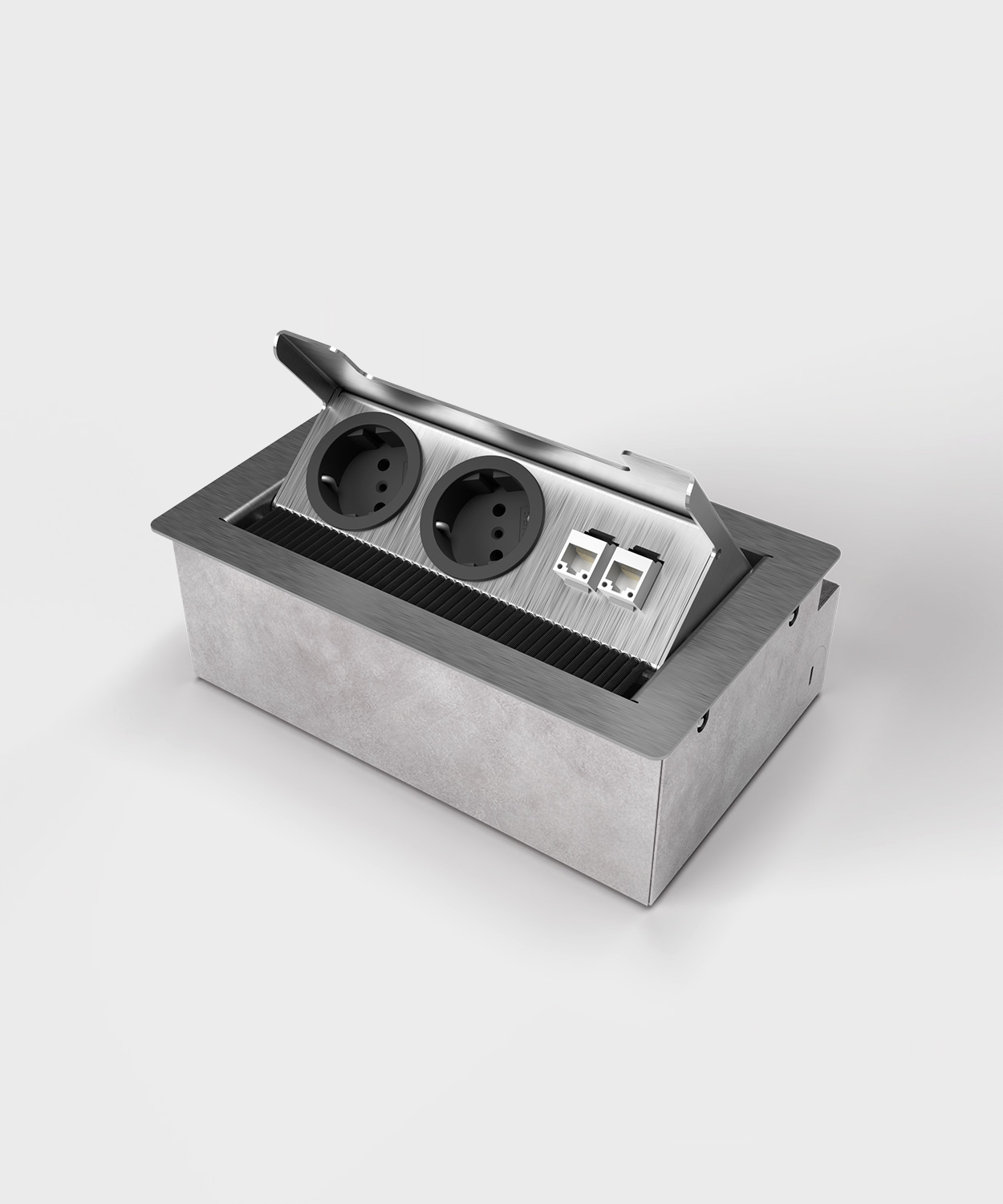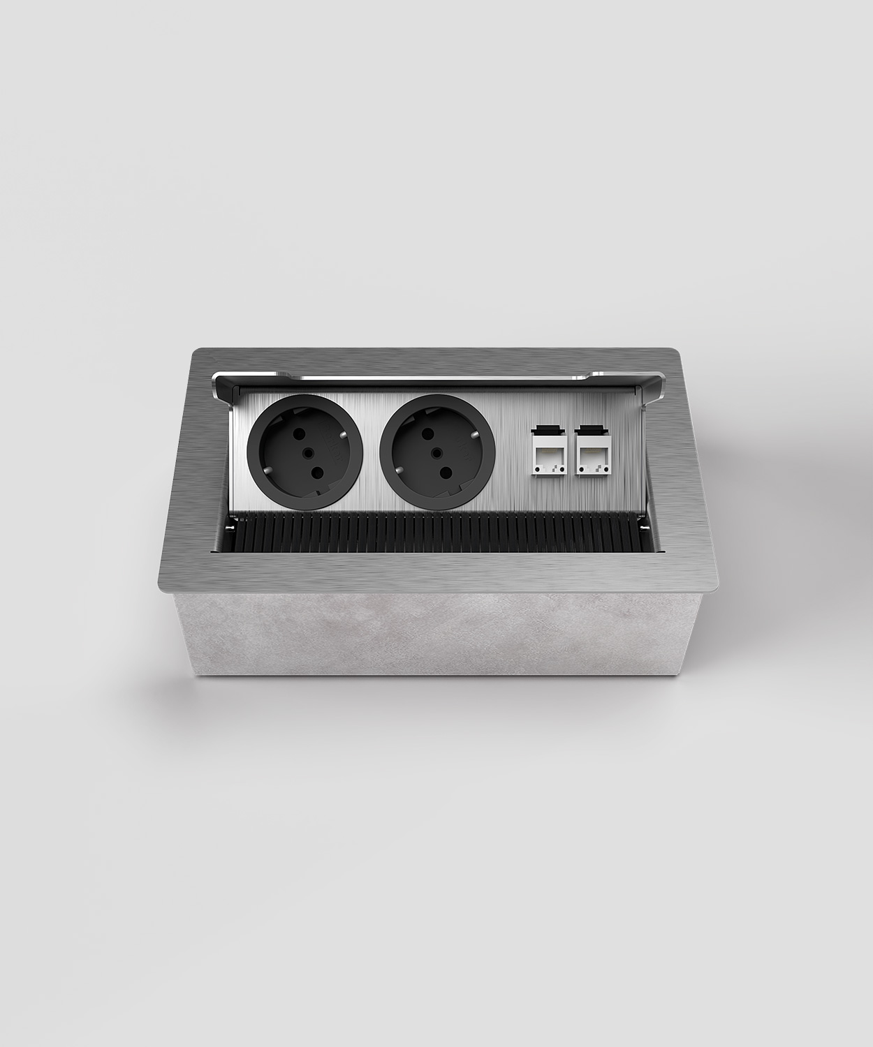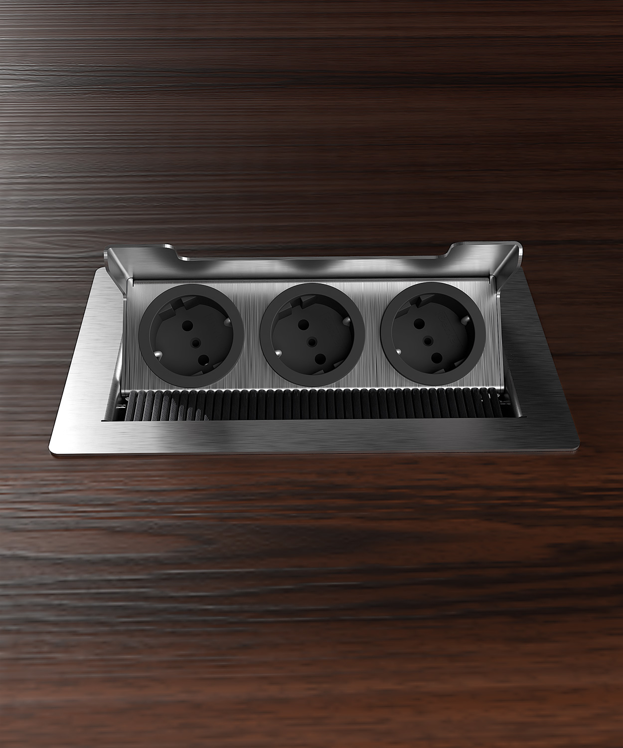 Tischsteckdose 3203E mit Anschlussmodul aus 1,5 mm Edelstahl, geschliffen, mit Klappdeckel. Der Klappdeckel schließt auch bei gesteckten Steckern. Zur Montage ist der Geräteträger herausnehmbar. Mit einer Flächenlast von 120 kg ist die Tischsteckdose 3202E auch als Bodensteckdose einsetzbar. Besonders für Arbeitsflächen, Hohlböden, Messebereiche etc. geeignet. Weitere Bestückungsvarianten auf Anfrage.