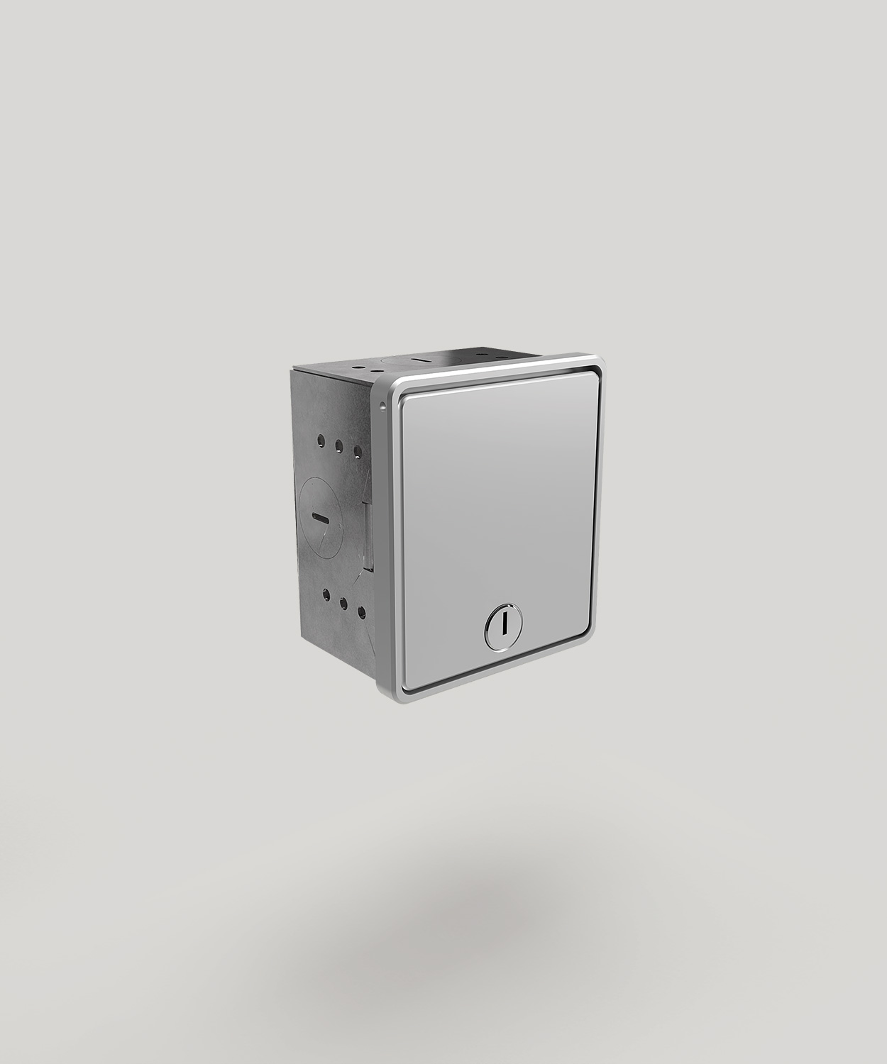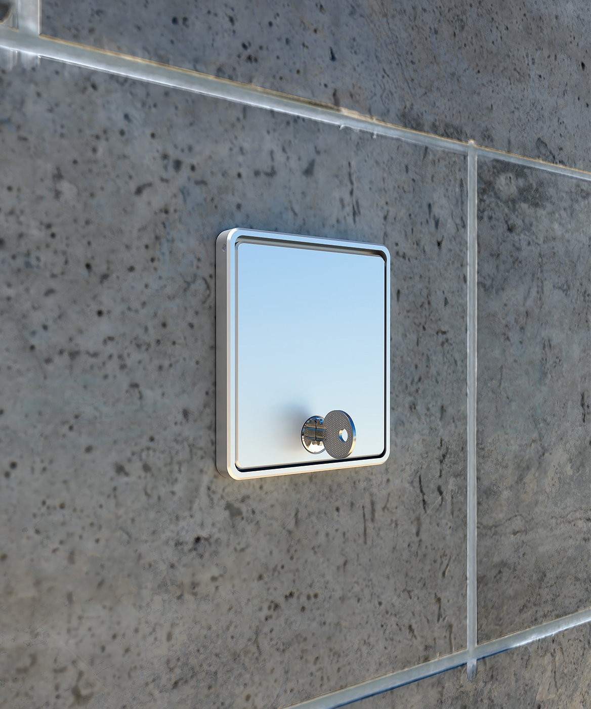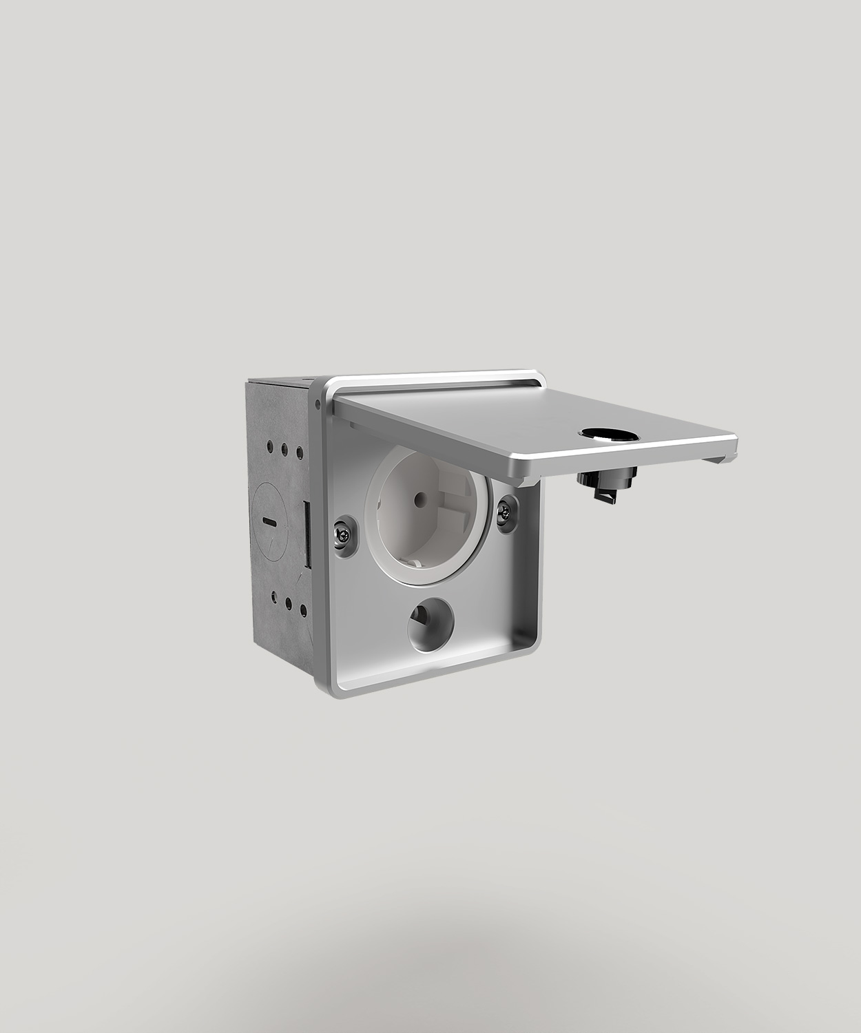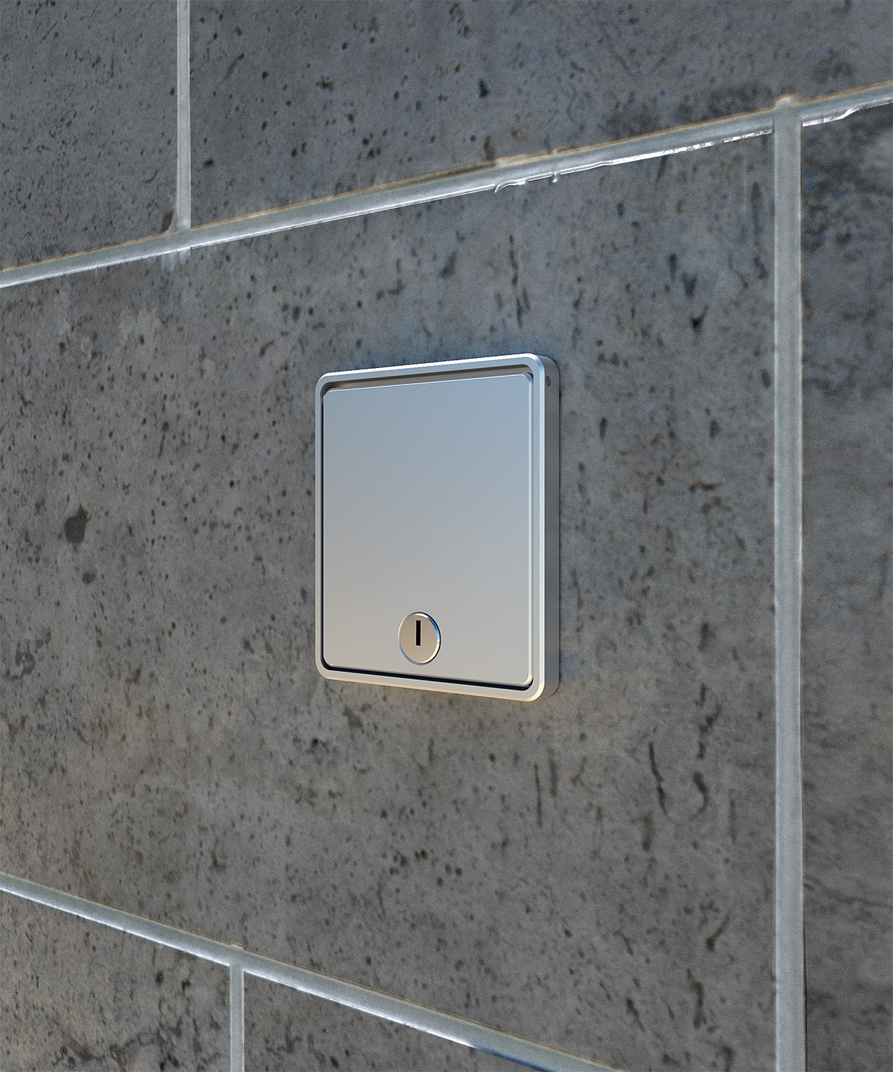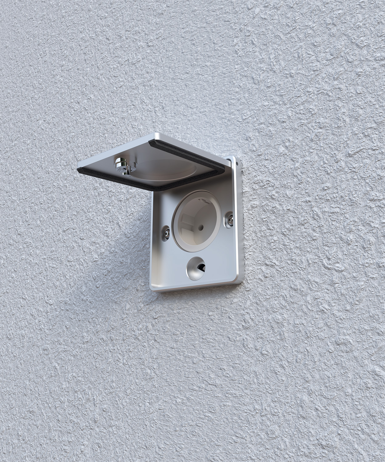 Wandsteckdose 5501A mit einem Steckplatz, spritzwassergeschützt, mit der Schutzart IP64 im geschlossenen Zustand (genutzt IP44). Der Klappdeckel ist mit einem Schlüssel verschließbar und somit vor unberechtigter Nutzung vornehmlich geschützt. Die Aufnahmebox besteht aus Edelstahl. Der Rahmen und der Deckel sind aus Aluminium gefertigt und in Alu-Natur eloxiert. Weitere Farben und Bestückungsvarianten auf Anfrage.