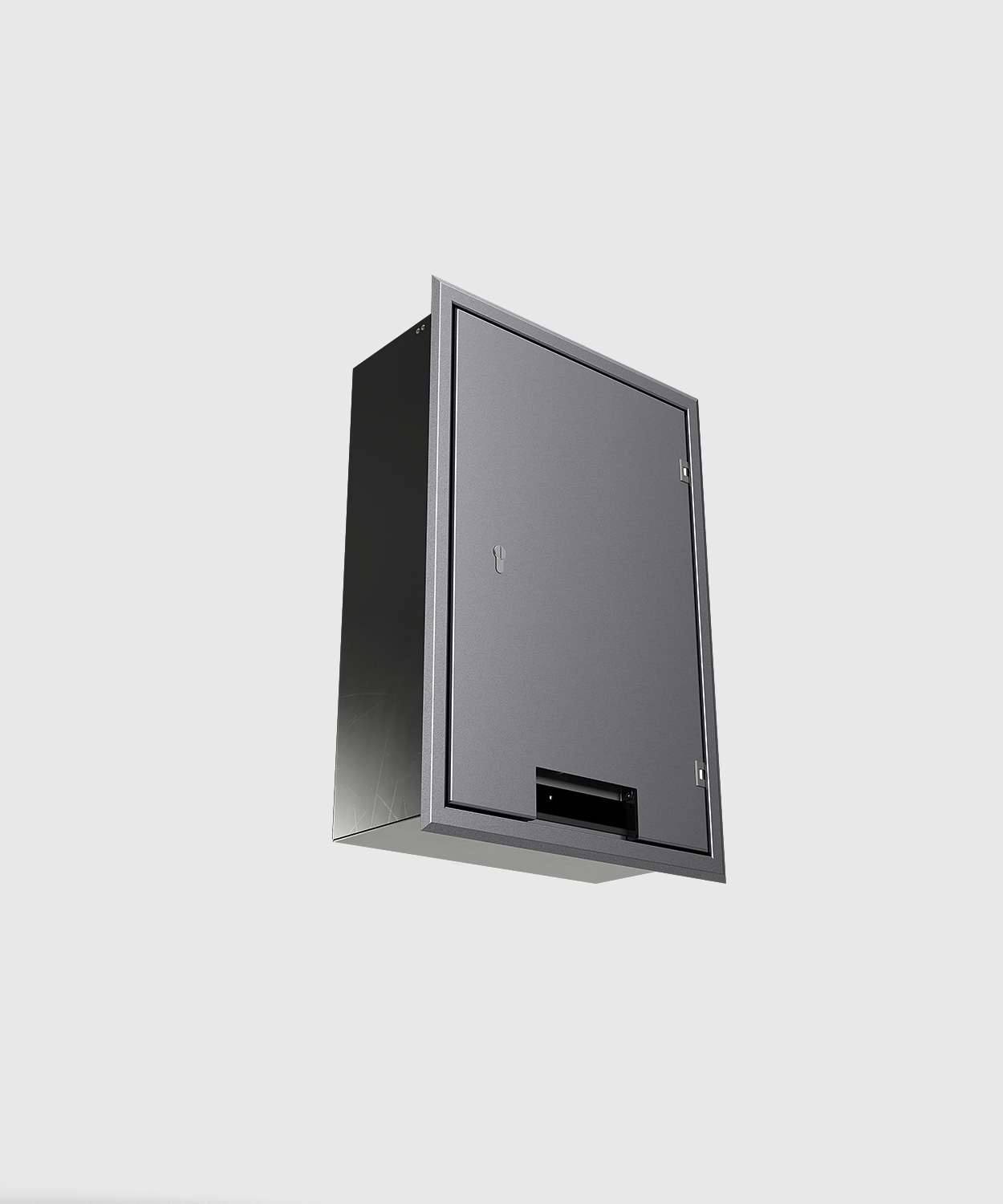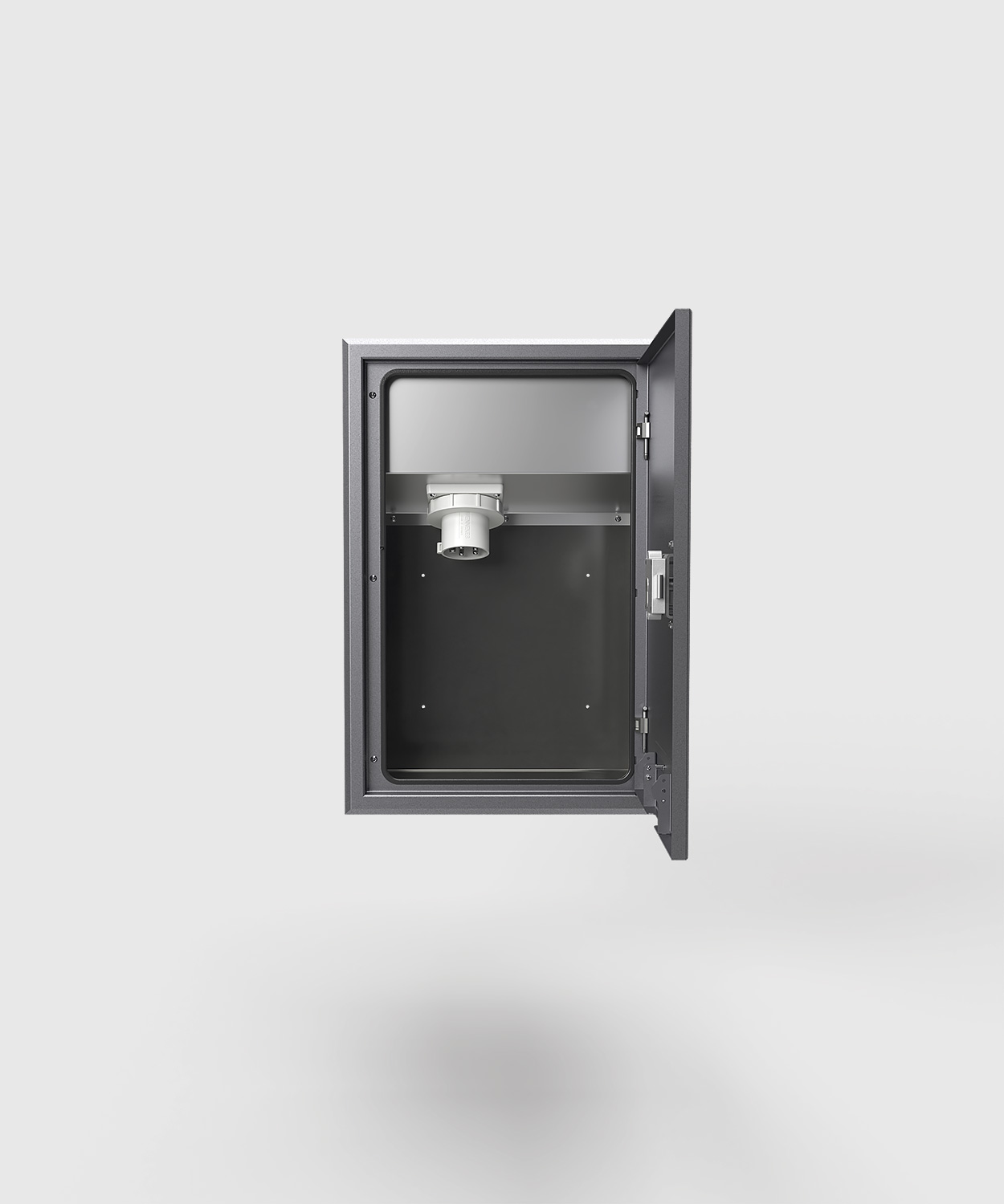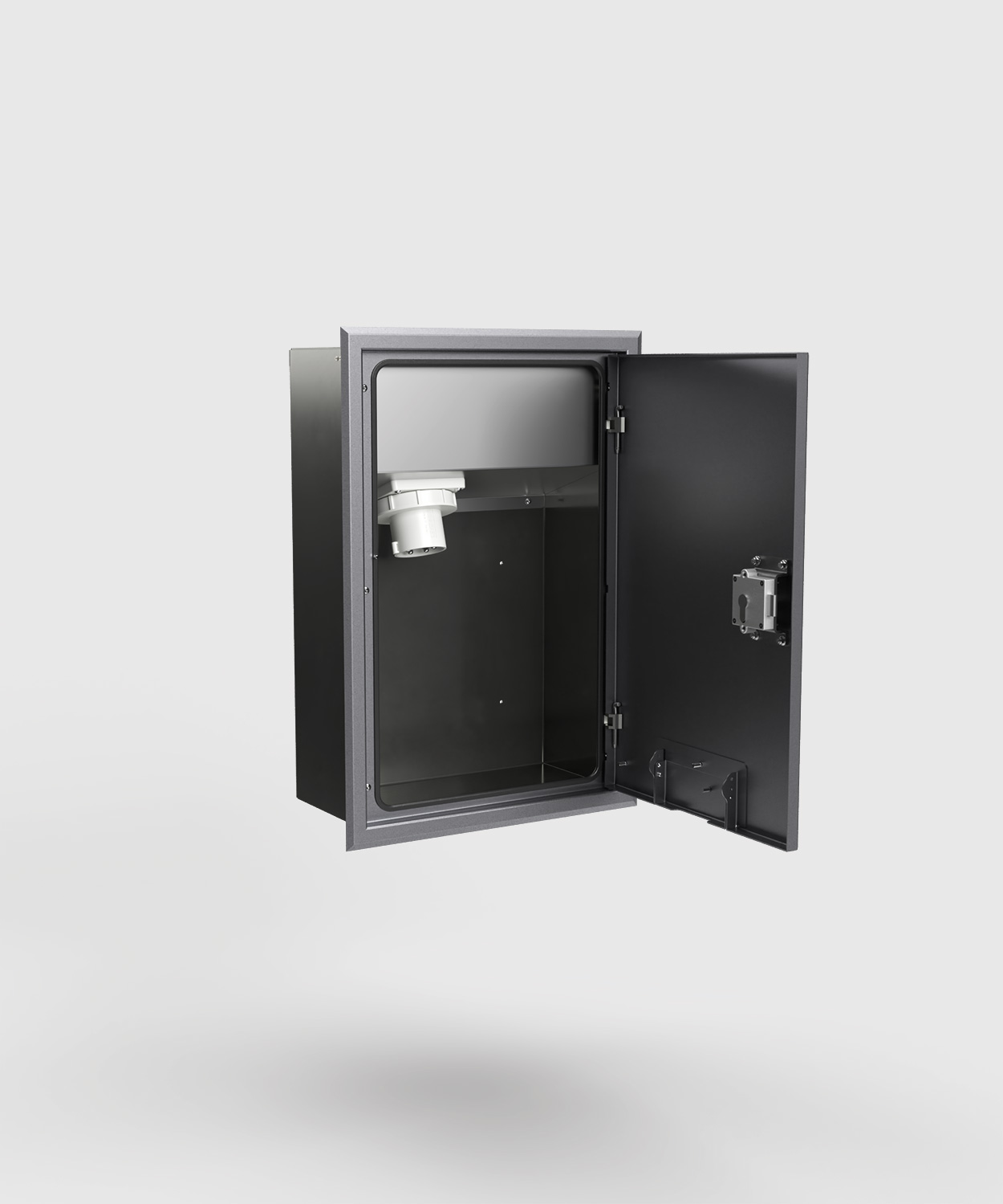 Wandverteiler 5723N mit einer CEE 5/63A Notstromeinspeisung, Schutzart IP 44 (elektrisch), spritzwassergeschützt. Das Gehäuse, der Rahmen, die Tür und der Geräteträger sind aus Edelstahl gefertigt. Die Tür schließt auch bei gestecktem Kabel und ist mit einem Profil-Halbzylinderschloss verschließbar. Der Unterputz-Wandverteiler ist für den Innen- und Außenbereich geeignet. Der Wandverteiler 5723N ist komplett einbaufertig vormontiert. Standardmäßig wird der Wandverteiler in den Sonderfarben DB701 oder DB703 (Grautöne) ausgeliefert. Auf Wunsch ist auch eine Beschichtung in Farben nach RAL möglich – andere Farben sind nur gegen einen Aufpreis umsetzbar.