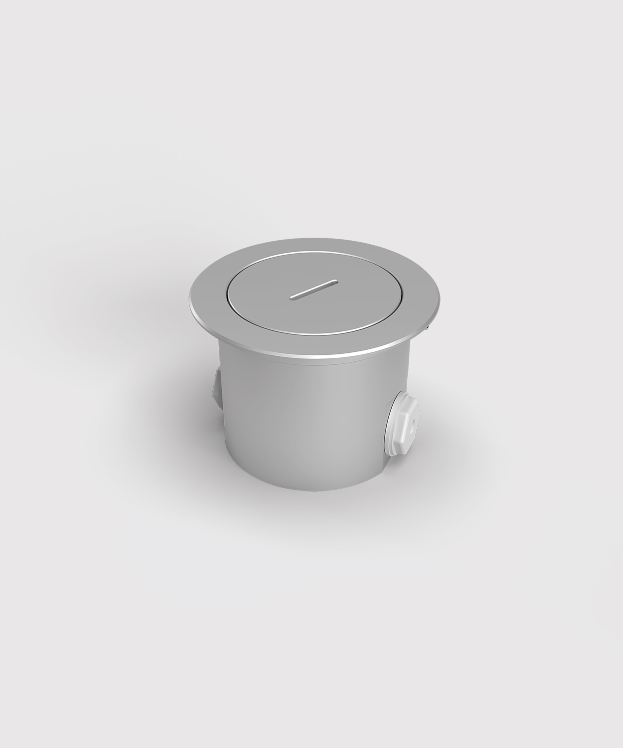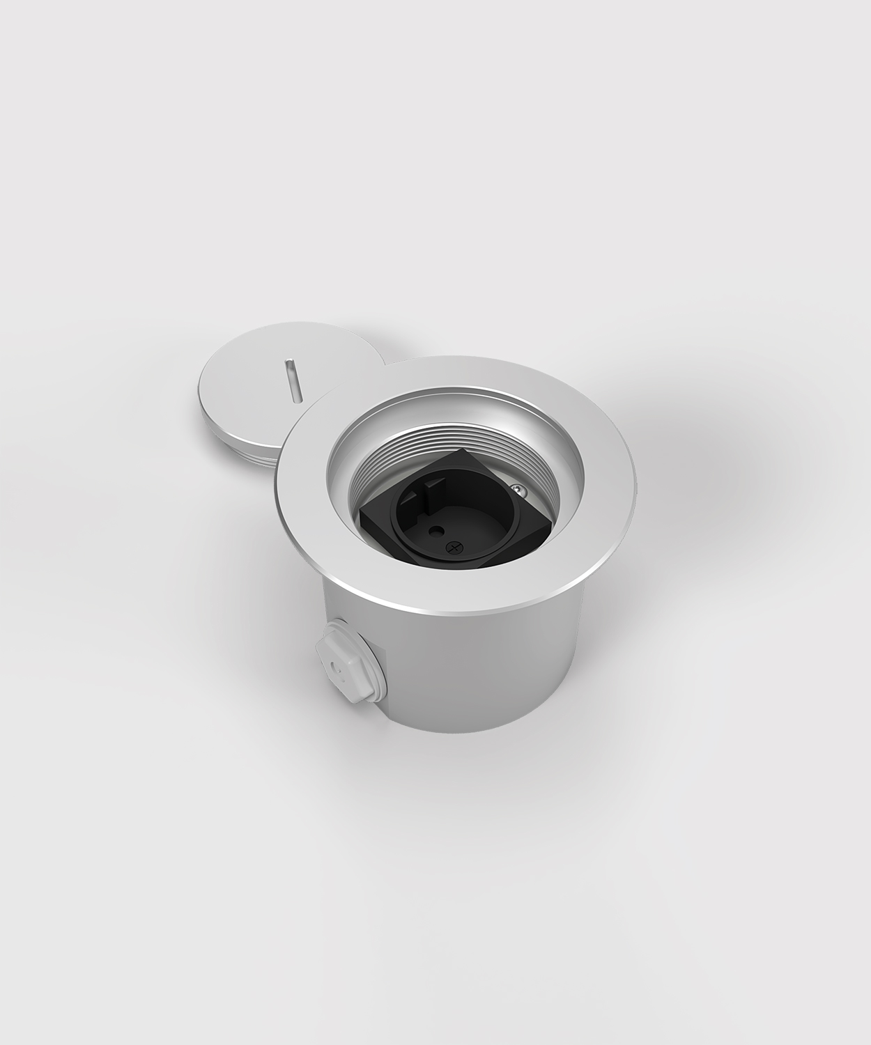 Runde Bodensteckdose 7501AW mit Schraubdeckel für den Außenbereich. Aufgrund des Rahmens ist die 7501AW ideal für Hohlböden geeignet, wie z. B. Terrassendielen. Der Rahmen, der Deckel und das Gehäuse sind aus massivem Aluminium gefertigt und eloxiert. Der Deckel kann komplett entnommen werden und ist mit einem Sonderschlüssel verschließbar. Im ordnungsgemäß verschlossenem Zustand ist die Bodensteckdose 7501AW wasserdicht. Weitere Bestückungsvarianten auf Anfrage.
