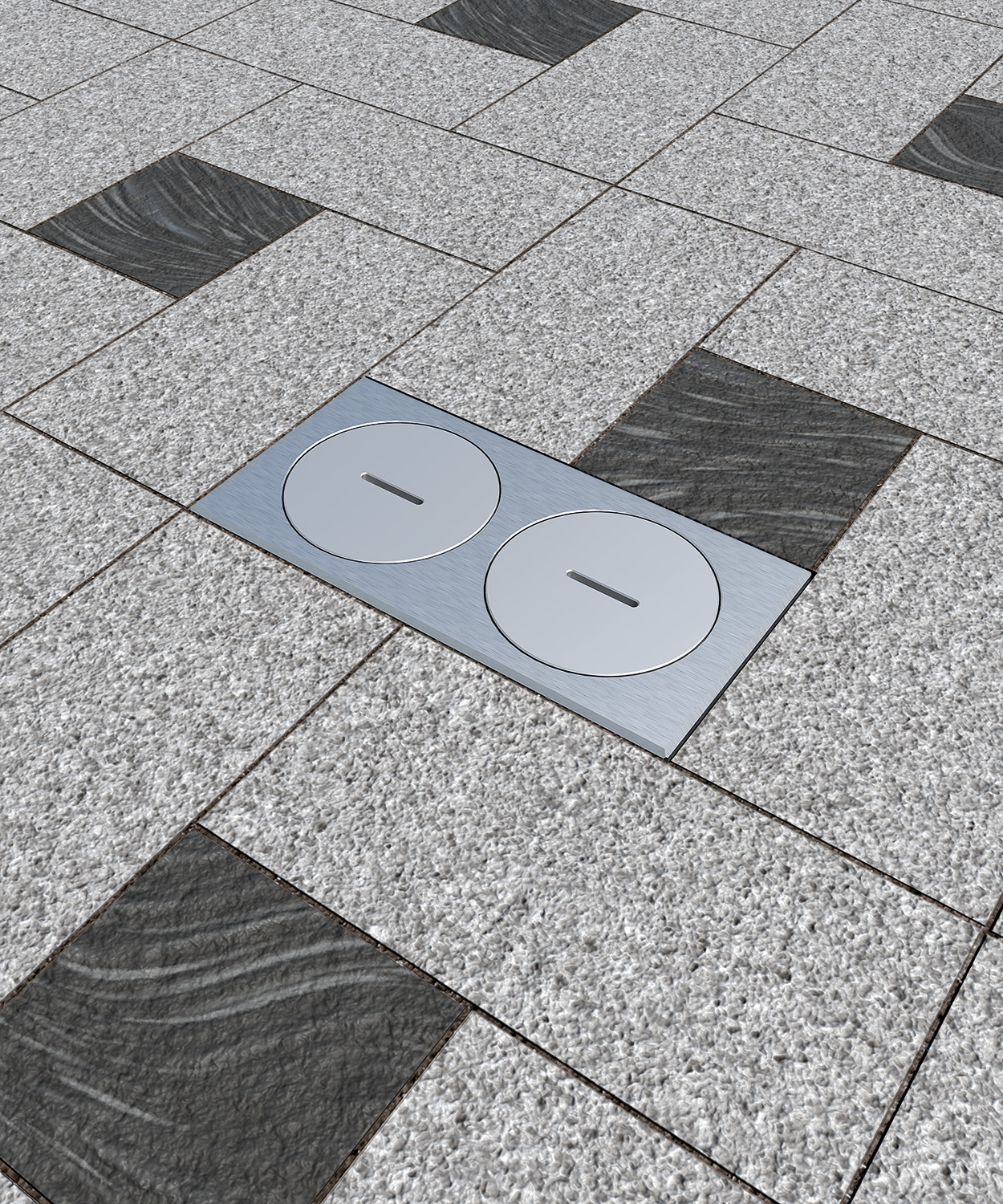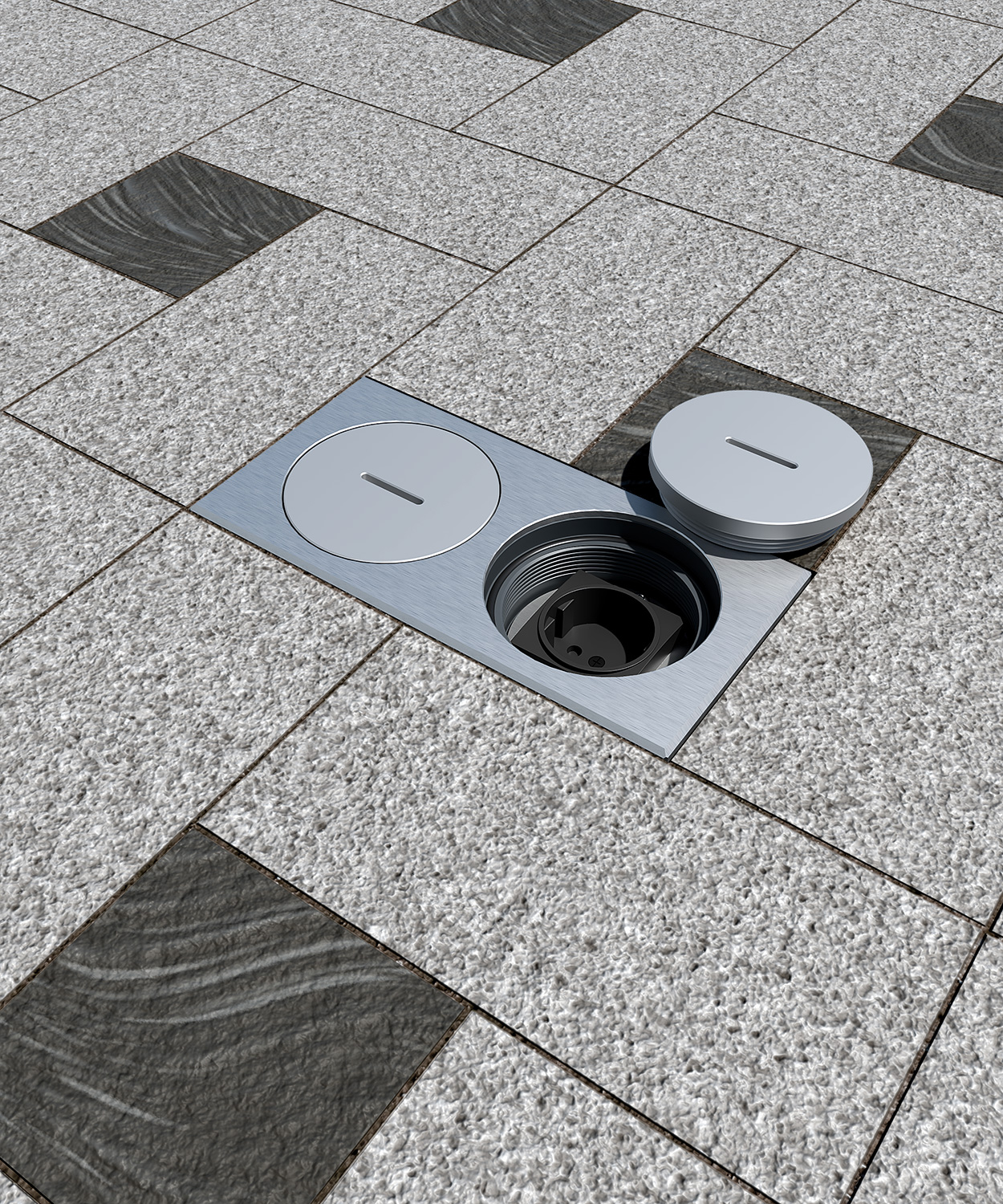 Bodensteckdose 7602A für den Außenbereich mit 2 separaten Steckplätzen, die jeweils mit einem Schraubdeckel verschlossen werden. Das Gehäuse der Bodensteckdose ist aus massivem, grauem PVC gefertigt. Der rechteckige Rahmen besteht aus massivem Aluminium, in Edelstahloptik eloxiert. Im geschlossenen Zustand ist die Bodensteckdose 7602A wasserdicht. Der Deckel kann komplett entnommen werden und ist mit einem Sonderschlüssel verschließbar. Weitere Bestückungsvarianten auf Anfrage.