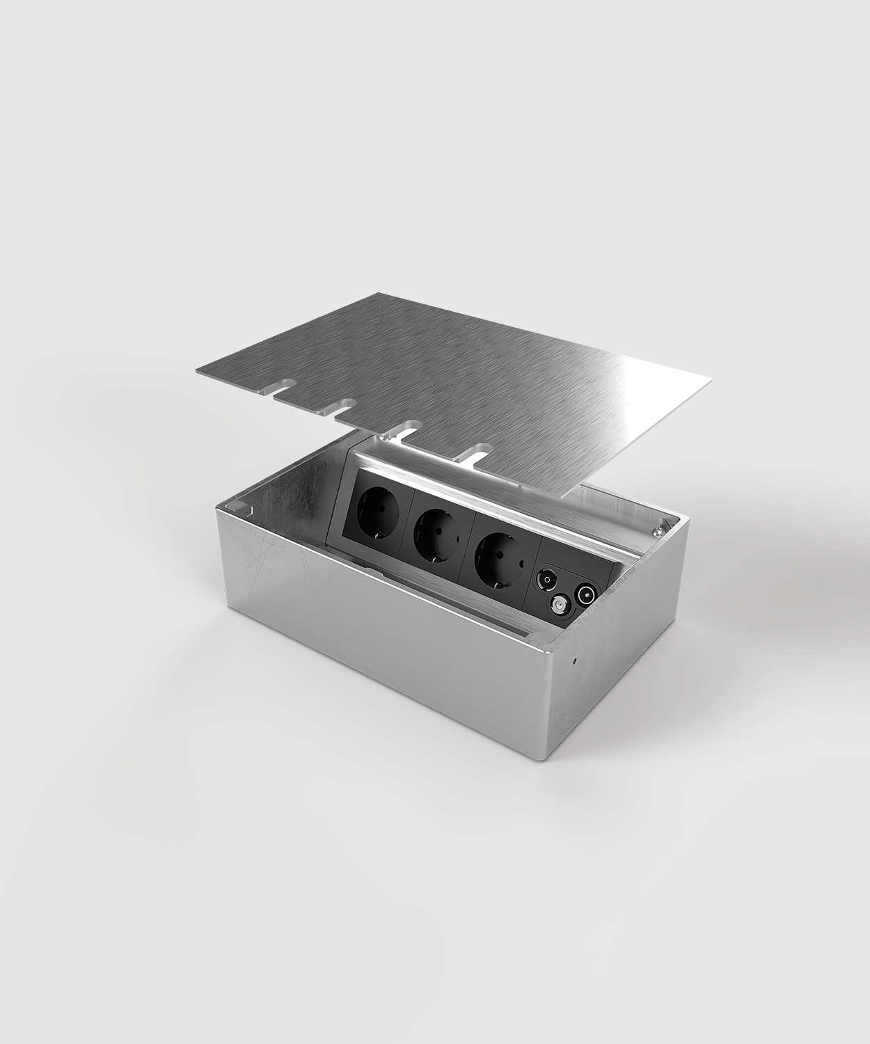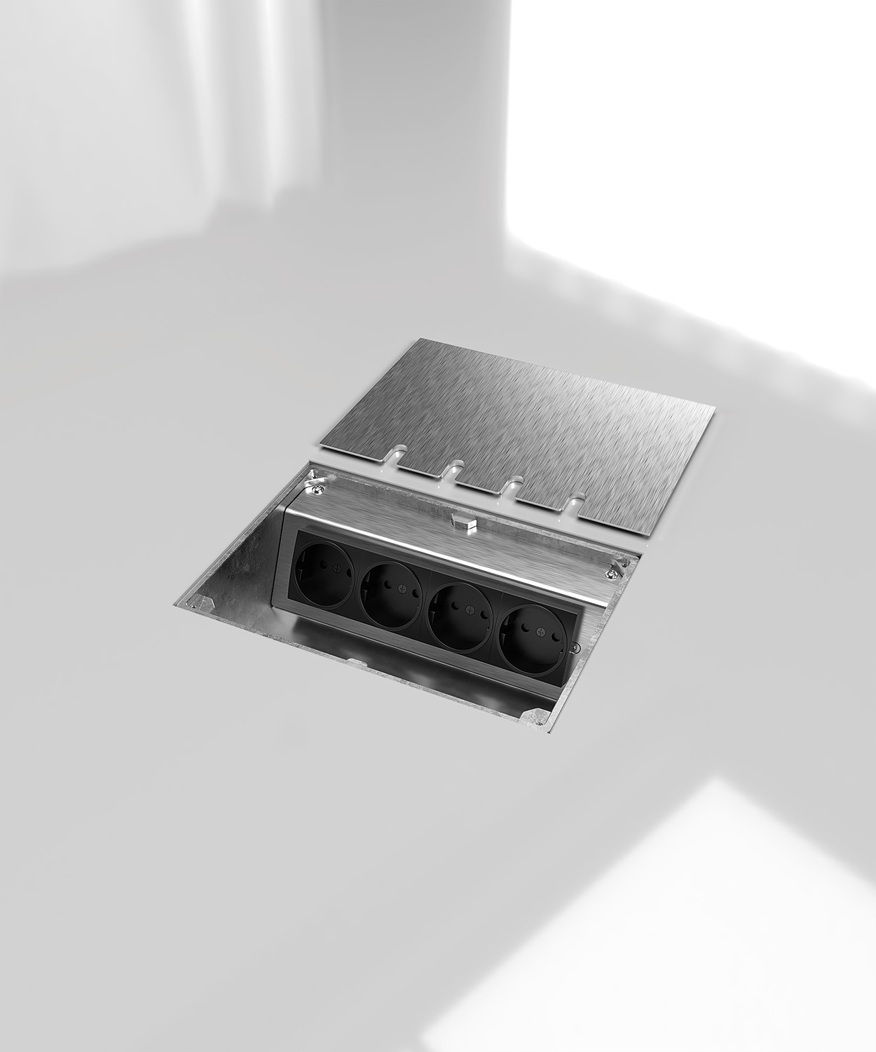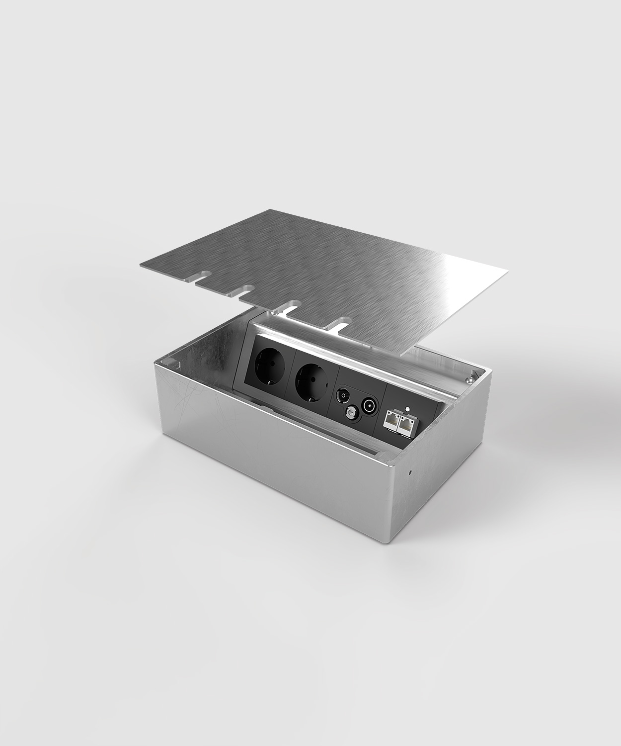 Bodensteckdose 8804E mit Gehäuse, Geräteträger und Deckel aus massivem Aluminium. Der Deckel zum Auflegen ist mit 2 mm Edelstahl (Oberfläche geschliffen) beklebt und schließt auch bei gesteckten Standardsteckern in gerader oder abgewinkelter Form. Weitere Bestückungsvarianten auf Anfrage.