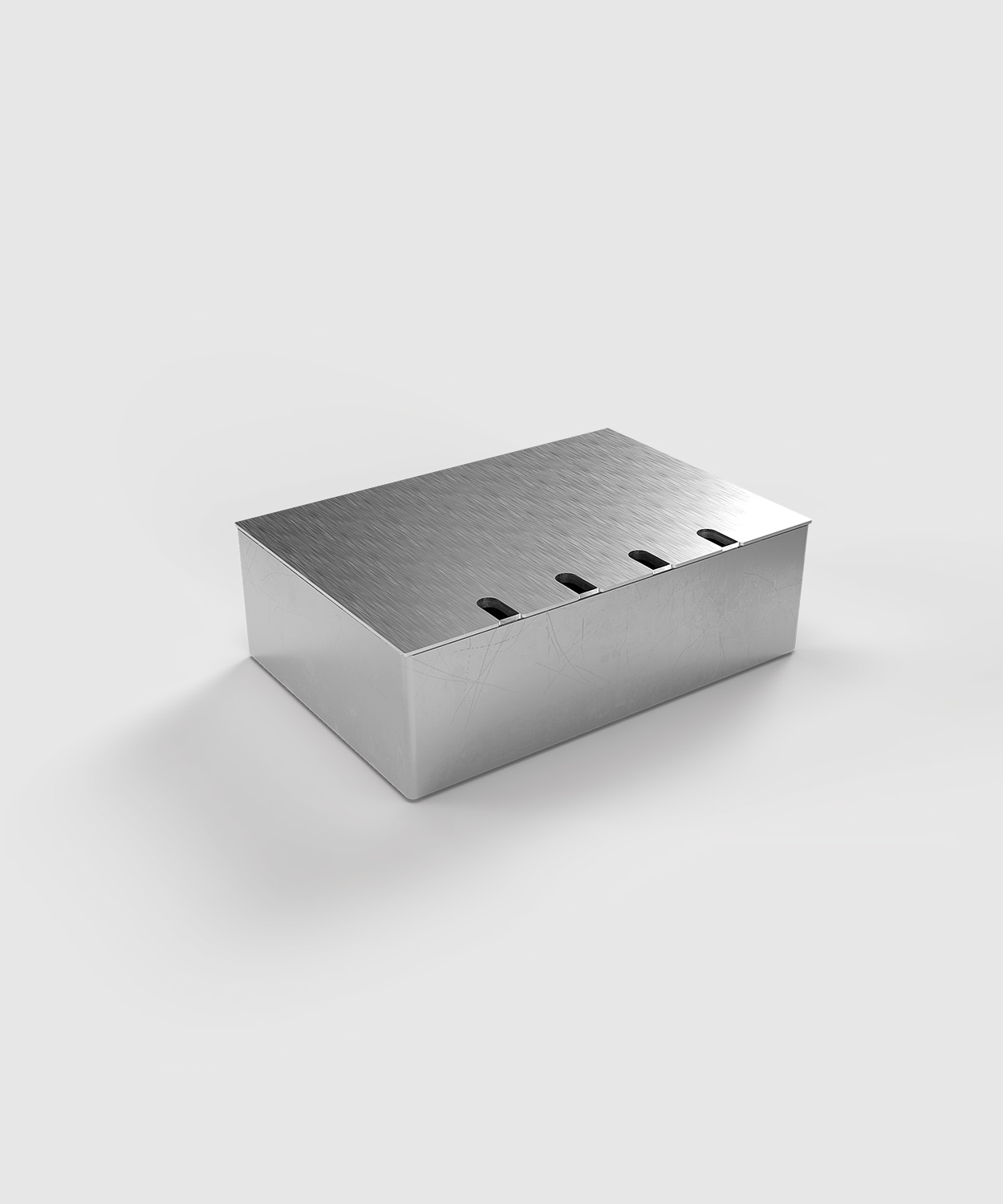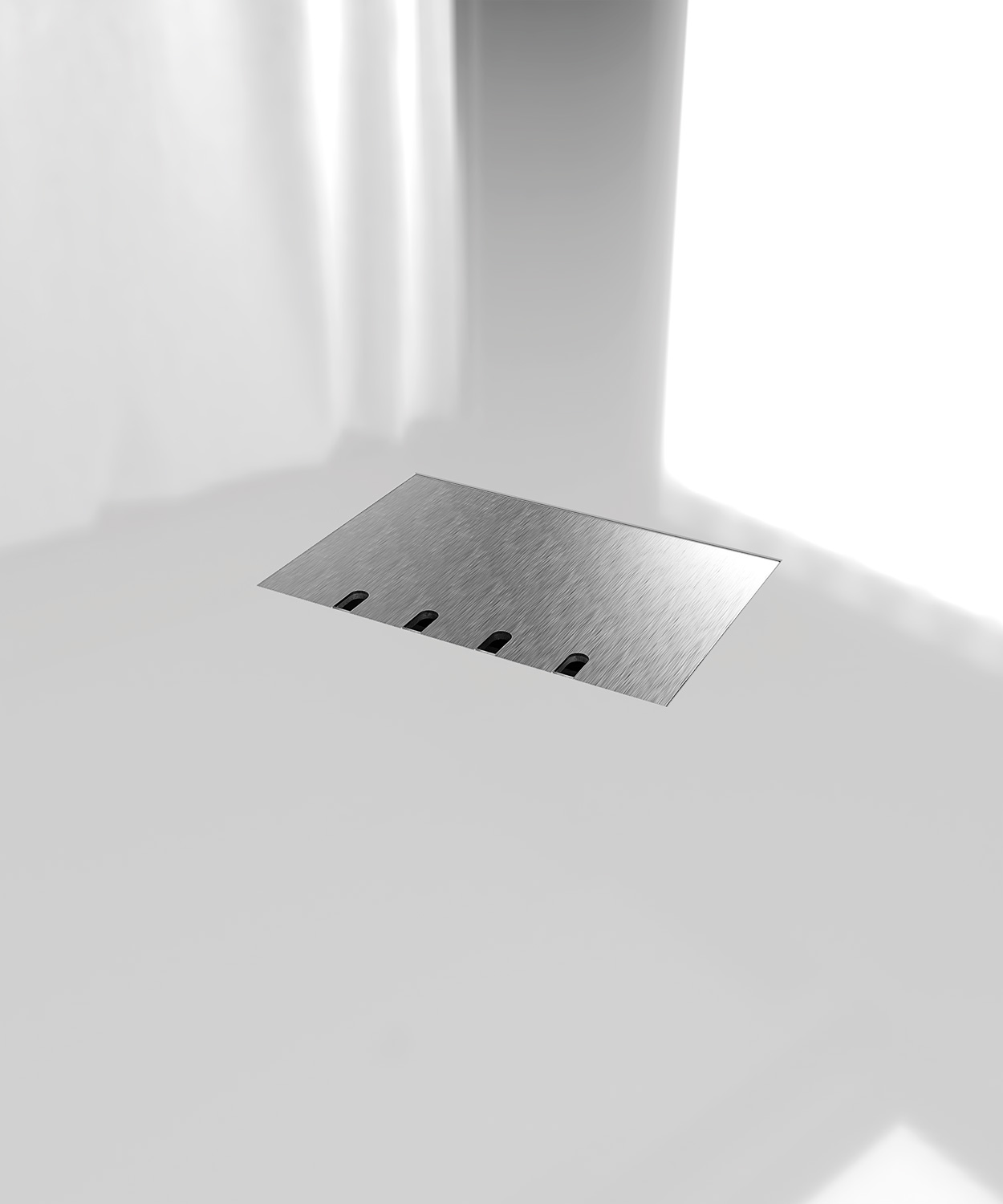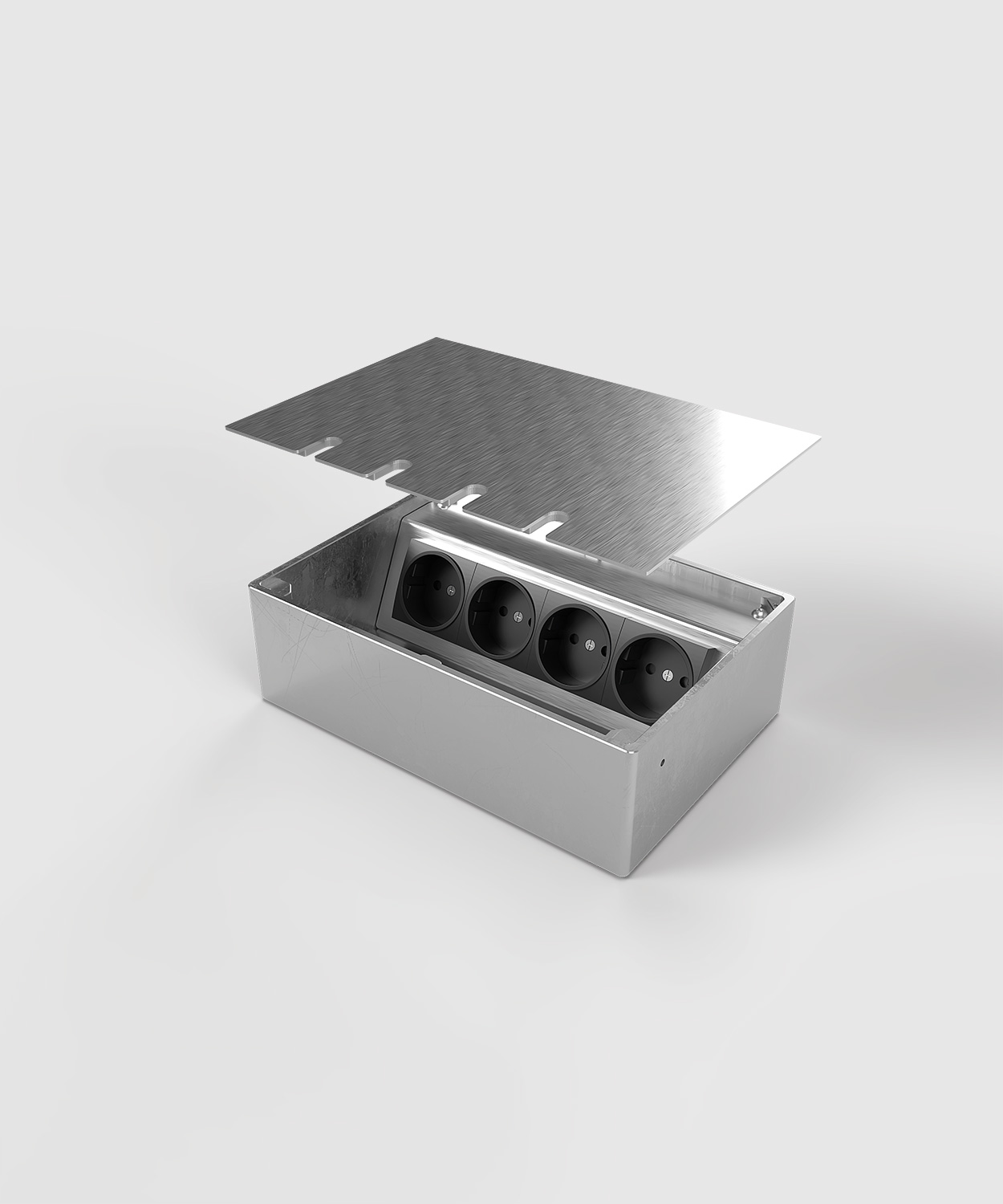 Bodensteckdose 8804E mit Gehäuse, Geräteträger und Deckel aus massivem Aluminium. Der Deckel zum Auflegen ist mit 2 mm Edelstahl (Oberfläche geschliffen) beklebt und schließt auch bei gesteckten Standardsteckern in gerader oder abgewinkelter Form. Weitere Bestückungsvarianten auf Anfrage.