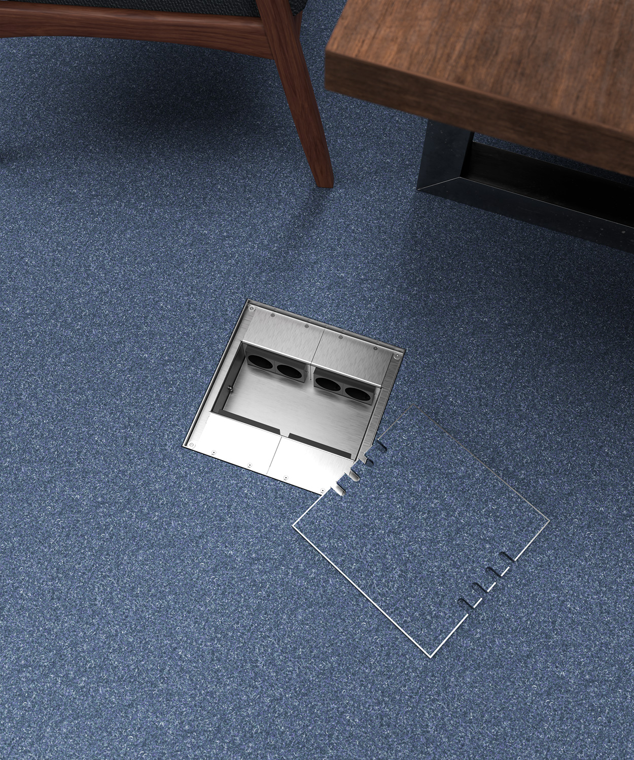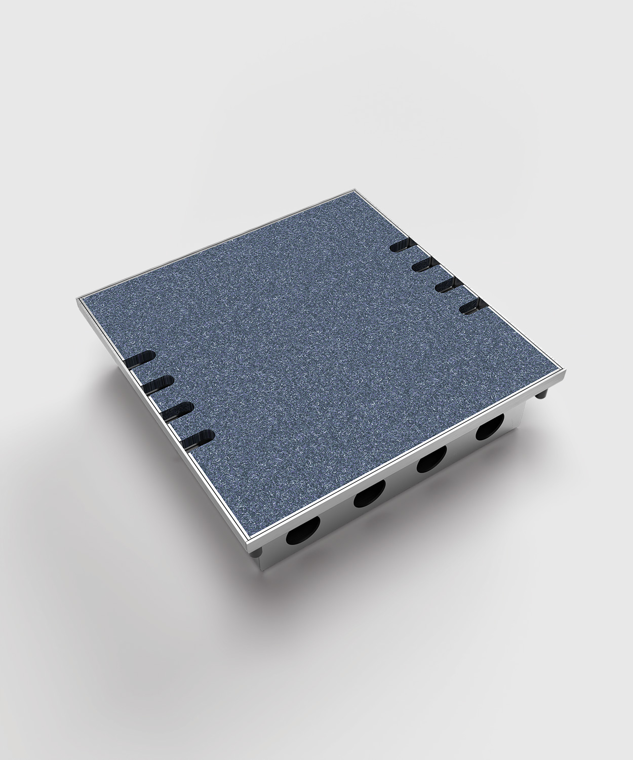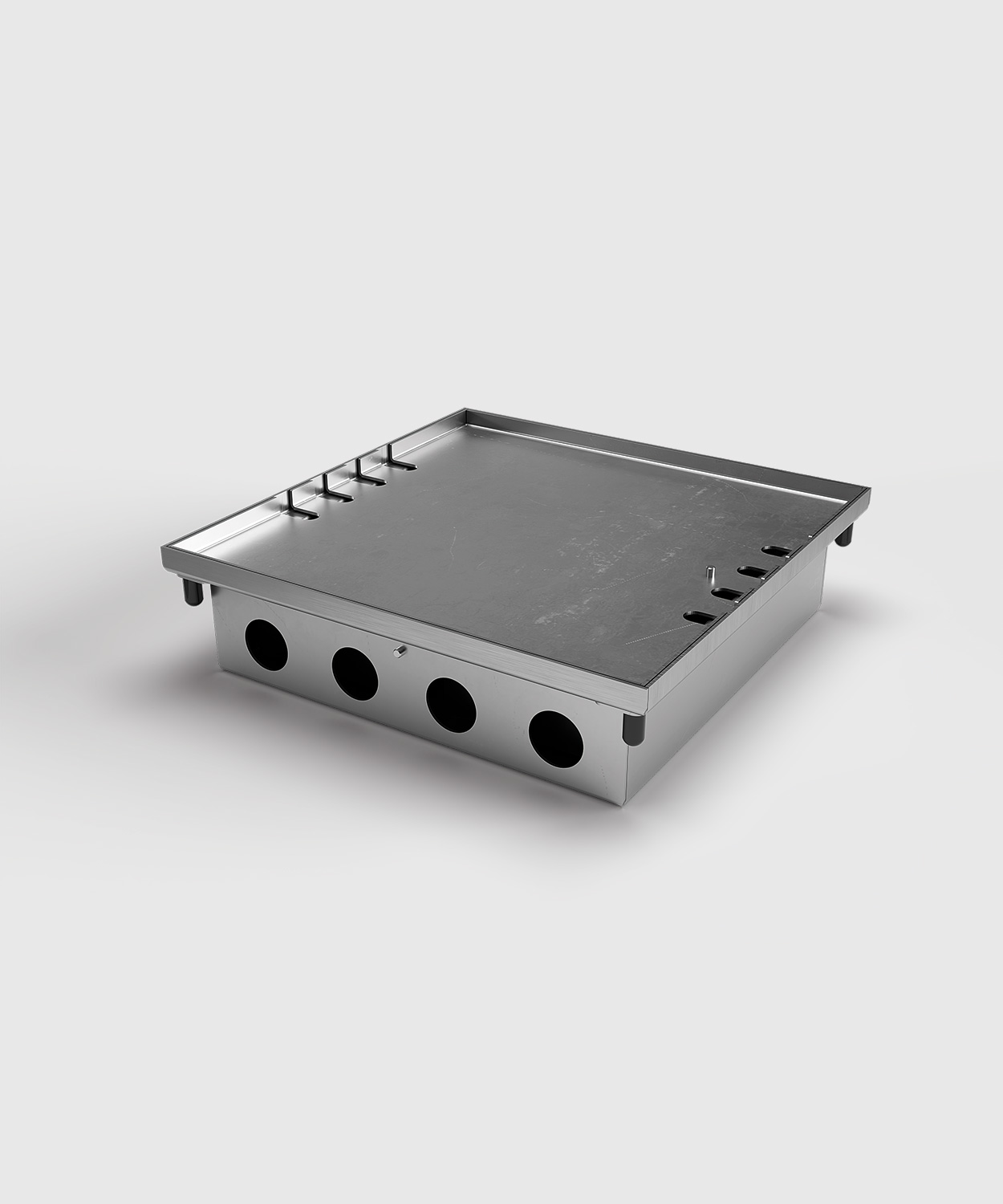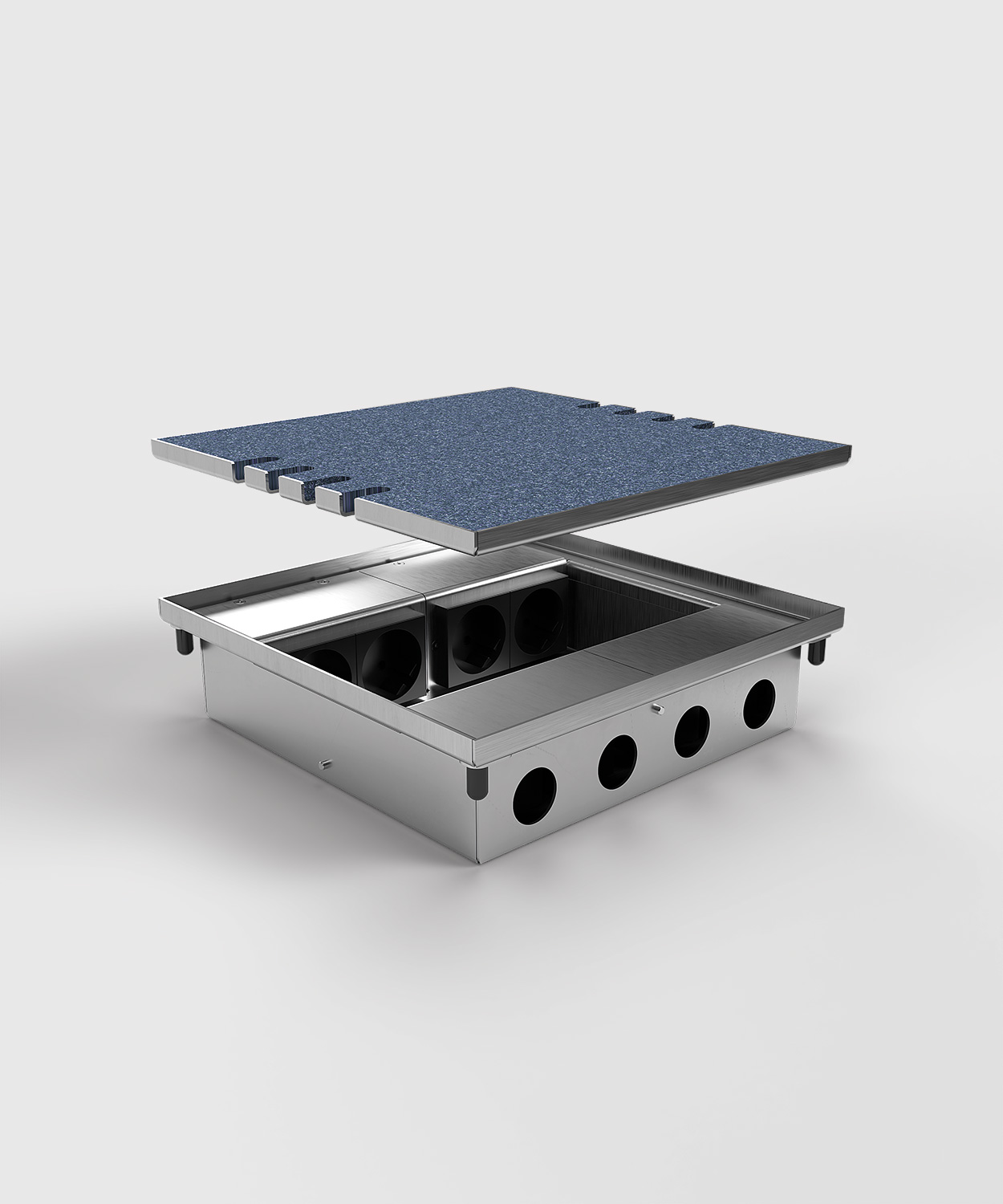 Bodentank 8808T aus Edelstahl. Innen befinden sich zwei Geräteträger aus Aluminium für je 4 Einheiten. Der Einbau kann an einer beliebigen Stellen im Fußboden erfolgen, da für die Leitungszuführung Rohrleitungen verwendet werden. Diese Ausführung ist wegen der geringen Höhe besonders gut für Fußböden im Altbaubereich geeignet. Der Deckel ist für die Einlage von Teppich-, Korkböden o. ä., mit einer Belagstärke von 5–7 mm konzipiert, und schließt auch bei gesteckten Steckern. Weitere Bestückungsvarianten auf Anfrage.