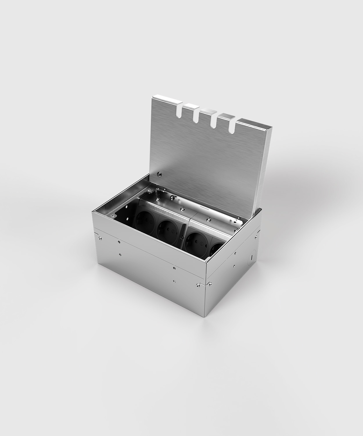 2 x Schuko • 1 x RJ45 2-fach CAT6A • 1 x Antenne (SAT/TV/R, Enddose)