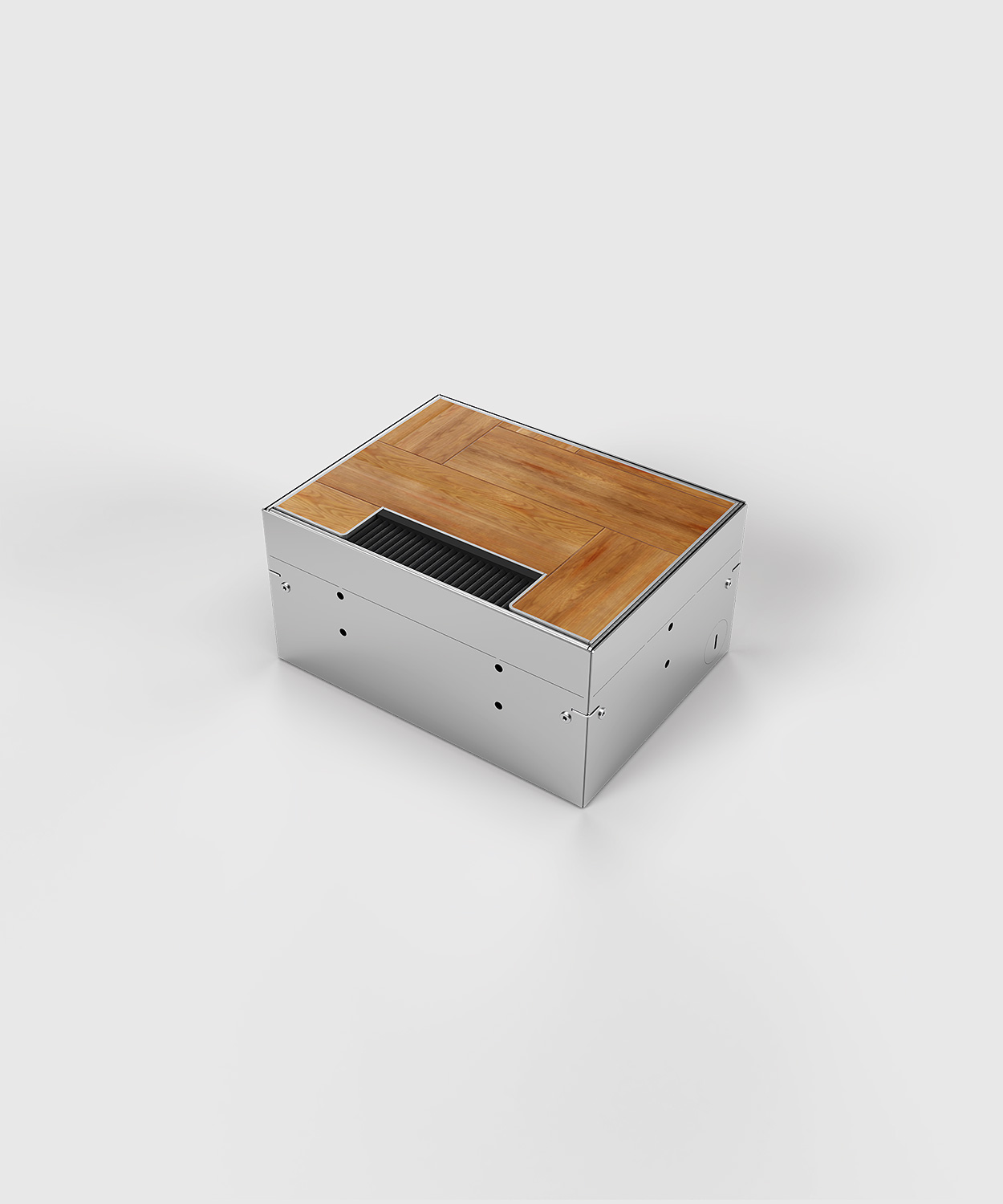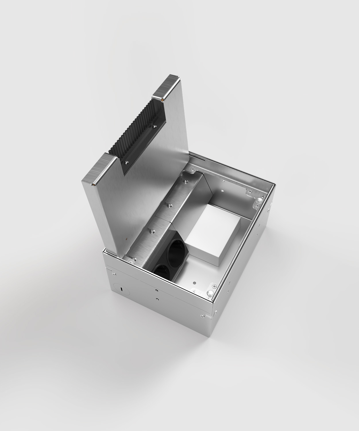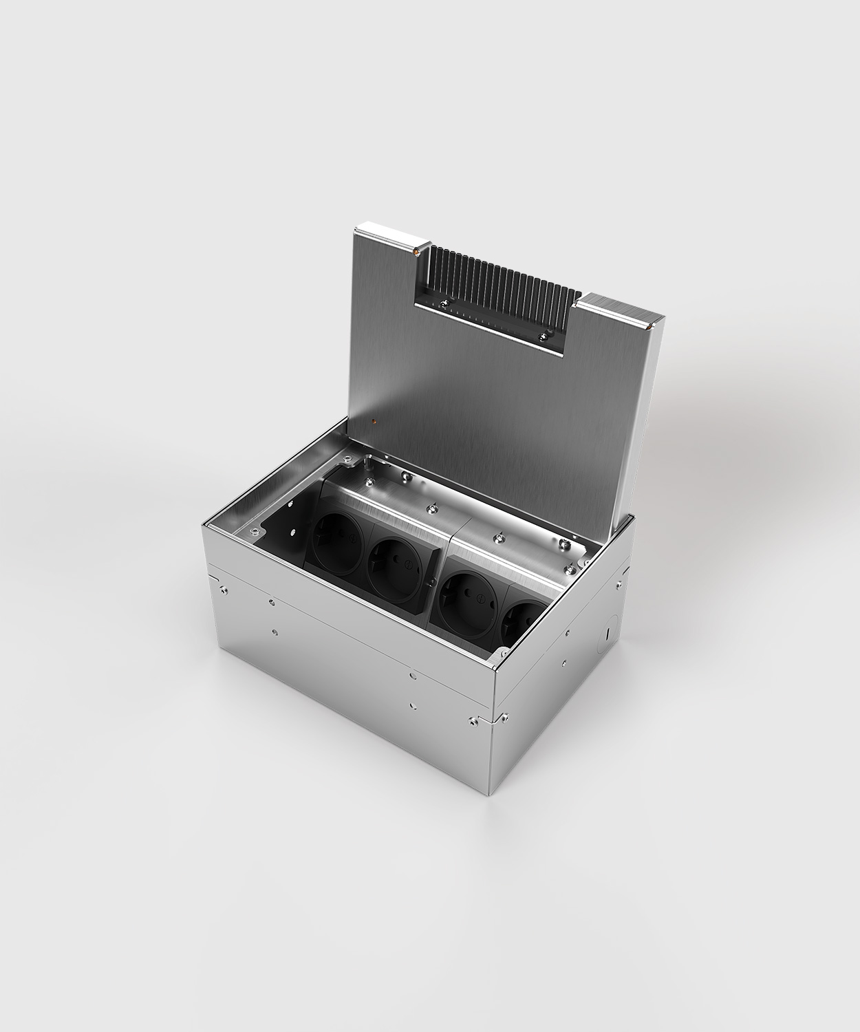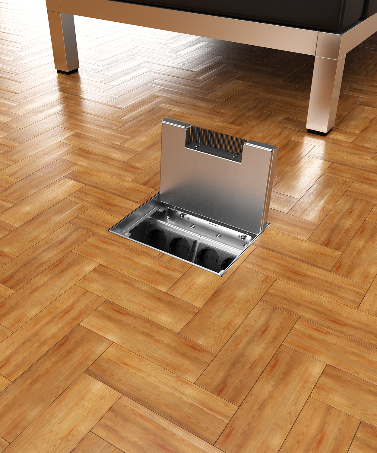 Höhenverstellbarer Bodentank 8904BB mit 4 Steckplätzen. Die Aufnahmebox, der Rahmen und der Deckel bestehen aus Edelstahl. In den herausnehmbaren Klappdeckel können Bodenbeläge wie Teppich, Parkett, Laminat etc. mit einer Stärke von 15 mm eingesetzt werden. Der Deckel schließt auch bei gesteckten Standardsteckern in gerader oder abgewinkelter Form. Der Kabelauslass wird durch Kunststoffbürsten vor groben Verschmutzung geschützt. Weitere Bestückungsvarianten auf Anfrage.