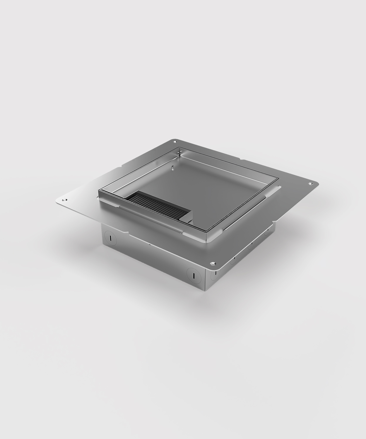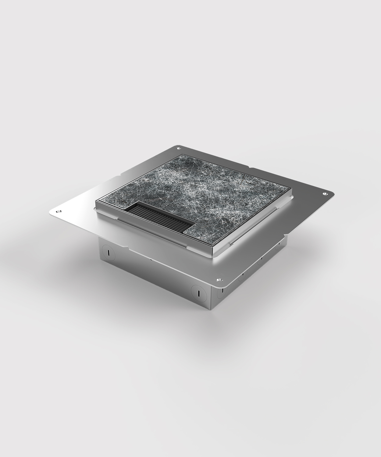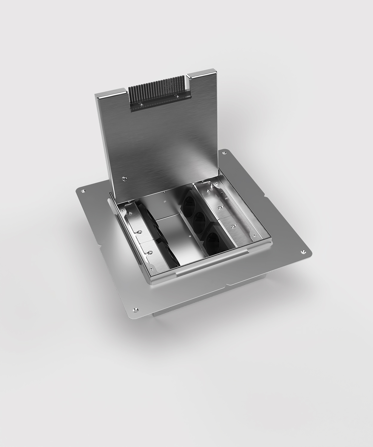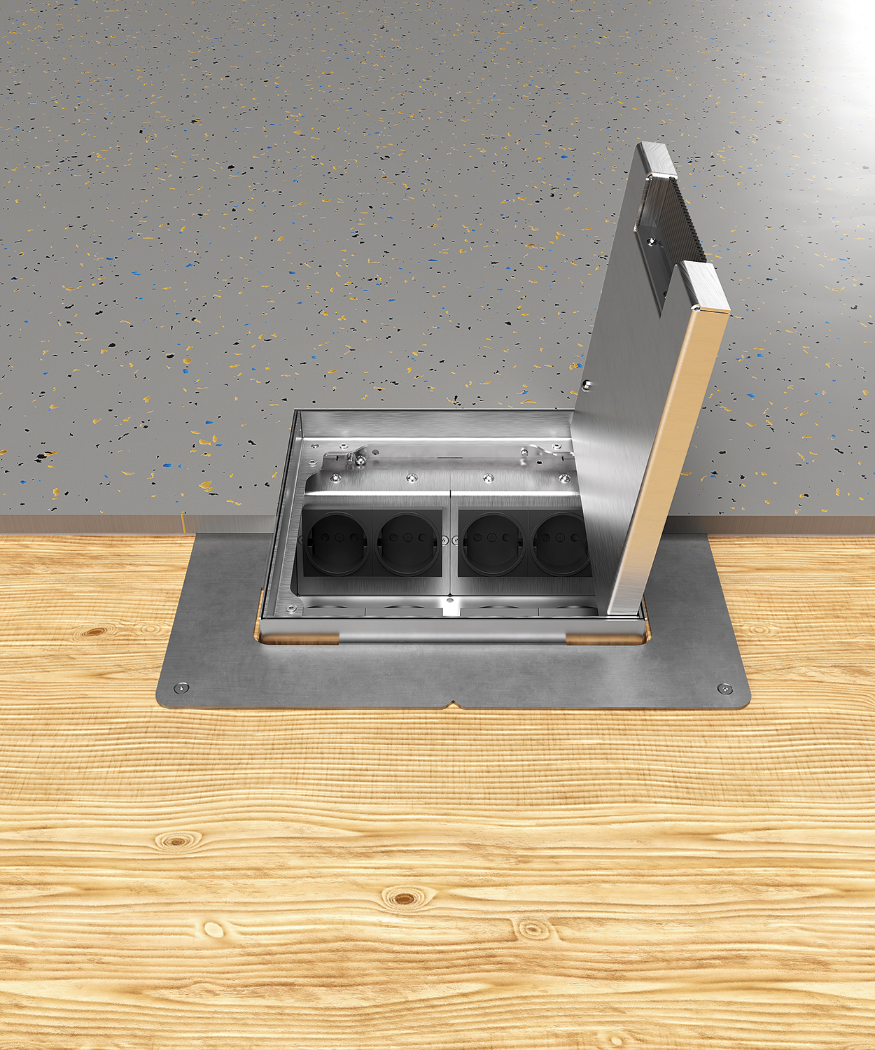 Höhenverstellbarer Hohlbodentank 8908HB mit 8 Steckplätzen. Die Aufnahmebox, der Rahmen und der Deckel bestehen aus Edelstahl. In den herausnehmbaren Klappdeckel können Bodenbeläge wie Teppich, Parkett, Laminat etc. mit einer Stärke von 15 mm eingesetzt werden. Der Deckel schließt auch bei gesteckten Standardsteckern in gerader oder abgewinkelter Form. Die Kunststoffbürsten dienen als Kabelauslass und schützen den Innenraum des Tanks vor grober Verschmutzung. Durch den Unterbaurahmen ist diese Bodensteckdose ideal für Hohlböden! Weitere Bestückungsvarianten auf Anfrage.