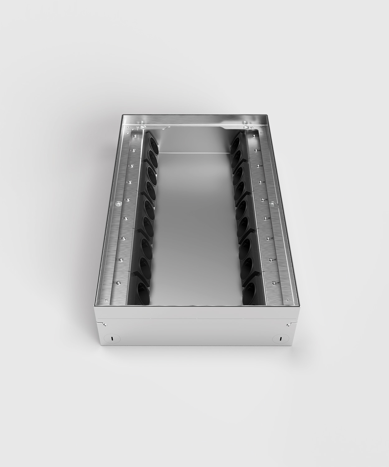 Höhenverstellbarer Bodentank 8920B mit 20 Steckplätzen. Die Aufnahmebox sowie der Rahmen und der Deckel bestehen aus Edelstahl. In den herausnehmbaren Deckel können Bodenbeläge wie Teppich, Parkett, Laminat etc. mit einer Stärke von 15 mm eingesetzt werden. Der Deckel verfügt über einen Kabelauslass und schließt auch bei gesteckten Standardsteckern in gerader oder abgewinkelter Form. Weitere Bestückungsvarianten auf Anfrage.
