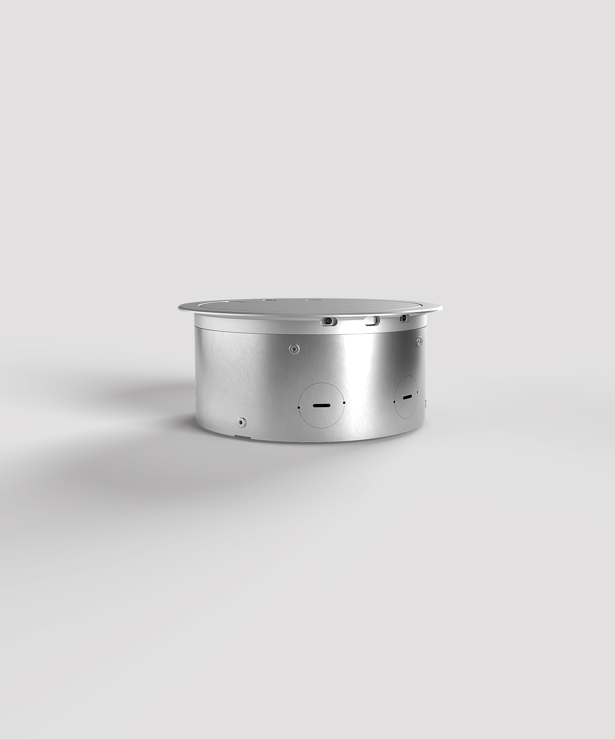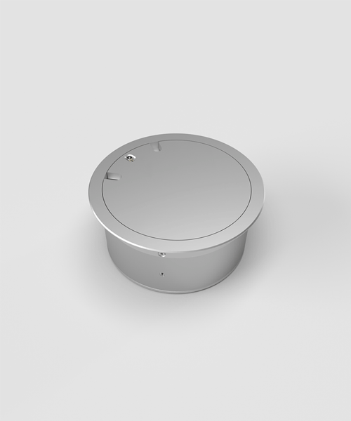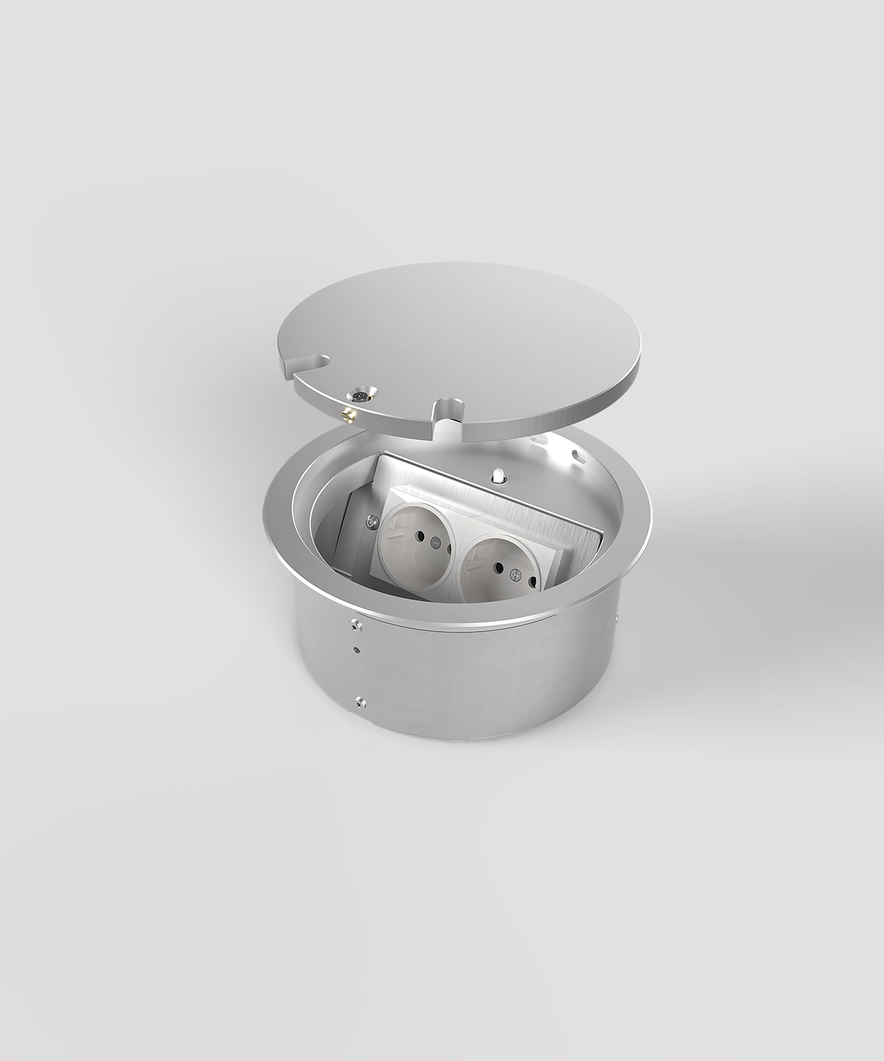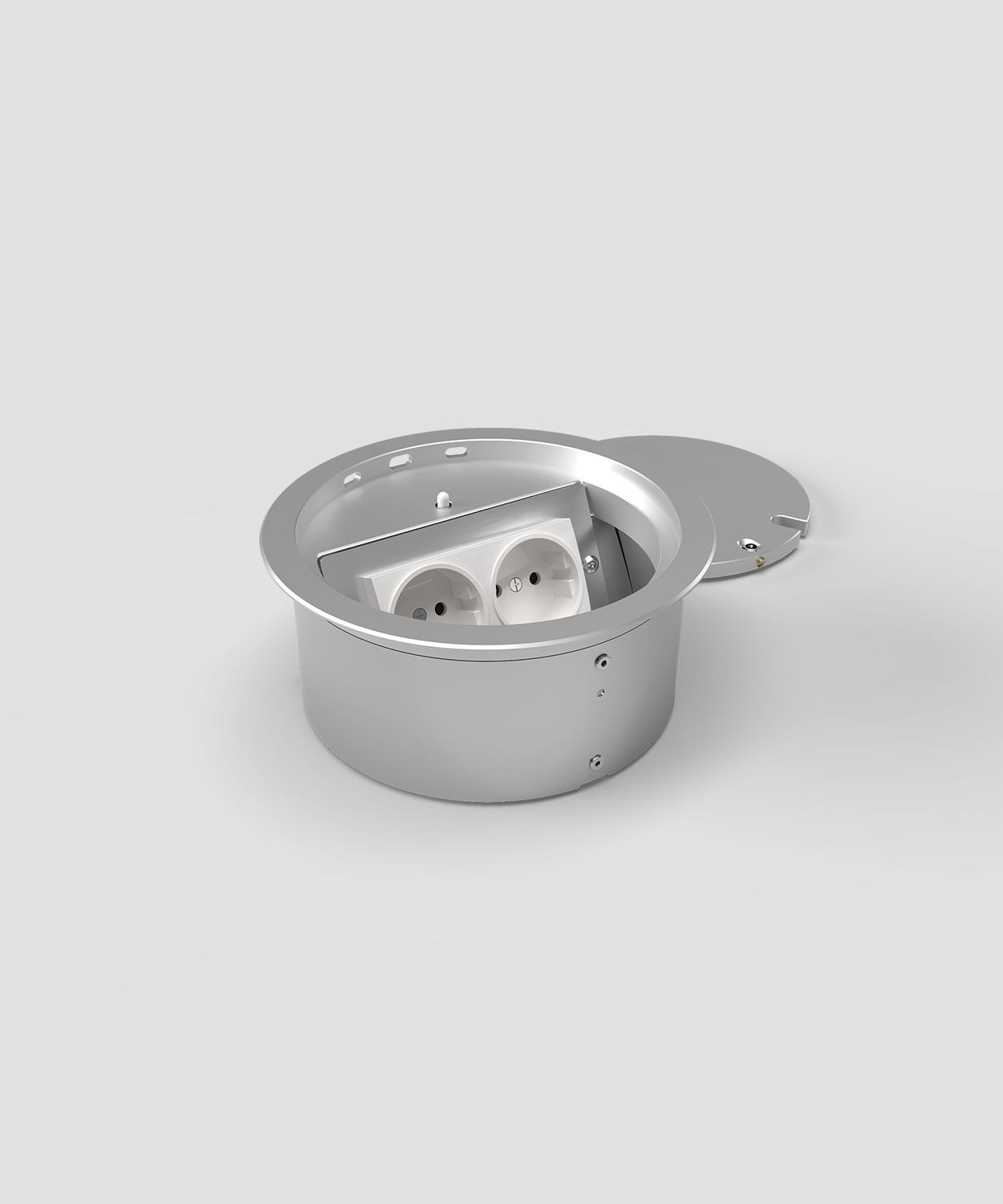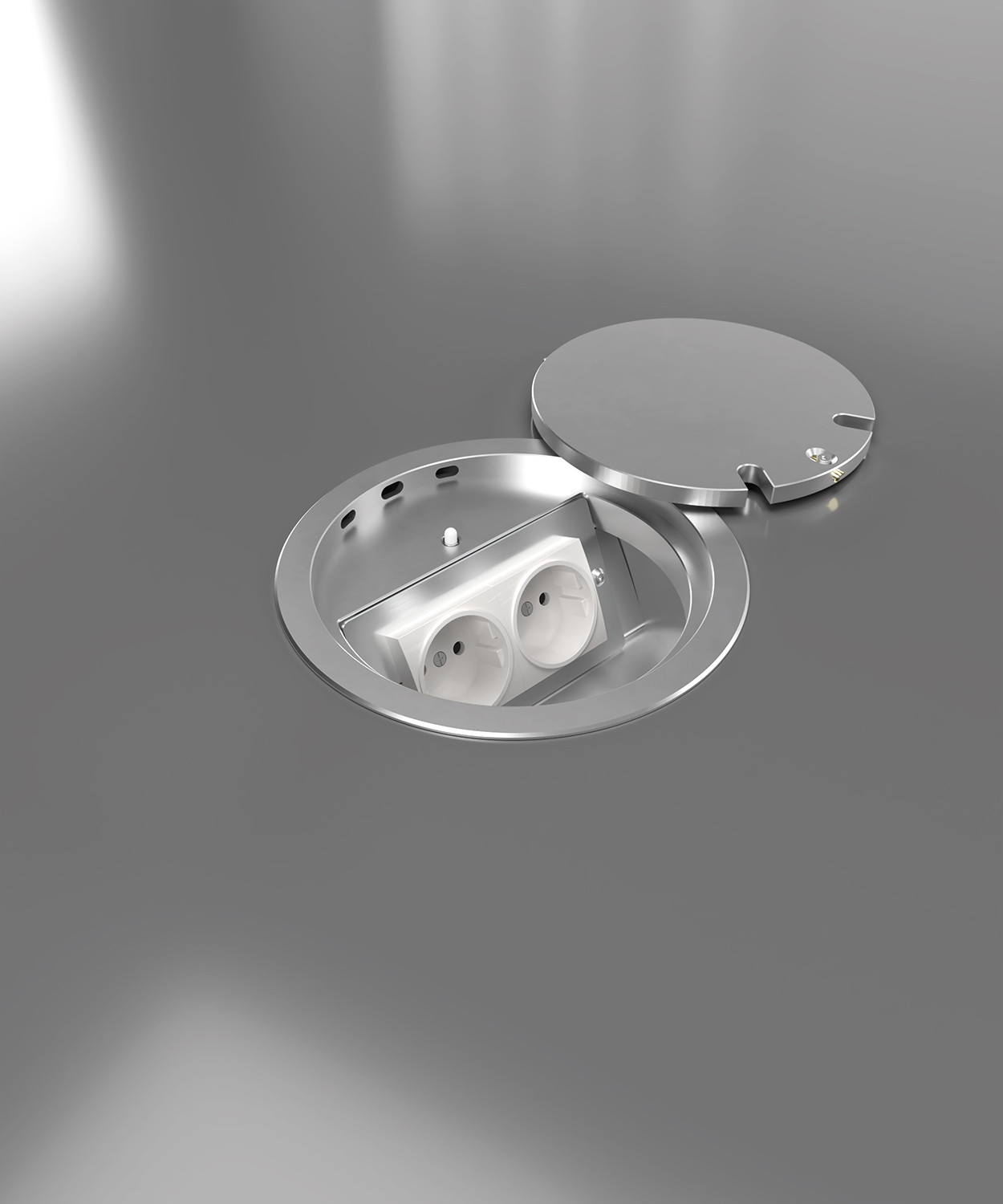Bodensteckdose 9902D mit 2 Steckplätzen. Der Rahmen und der Deckel sind aus massivem Aluminium gefertigt und in Alu-Natur eloxiert. Der Deckel schließt auch bei gesteckten Standardsteckern in gerader oder abgewinkelter Form. Durch eine Drehung des Deckels um 180° ist diese Ausführung auch zur Reinigung mit Nasskehrgeräten geeignet. Weitere Bestückungsvarianten auf Anfrage.