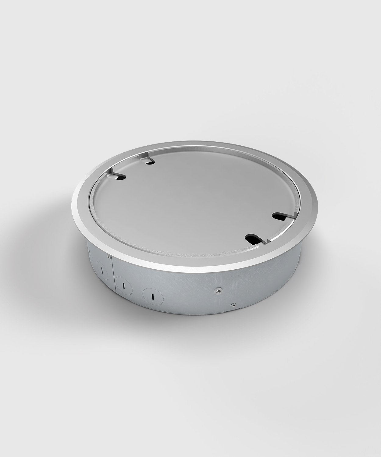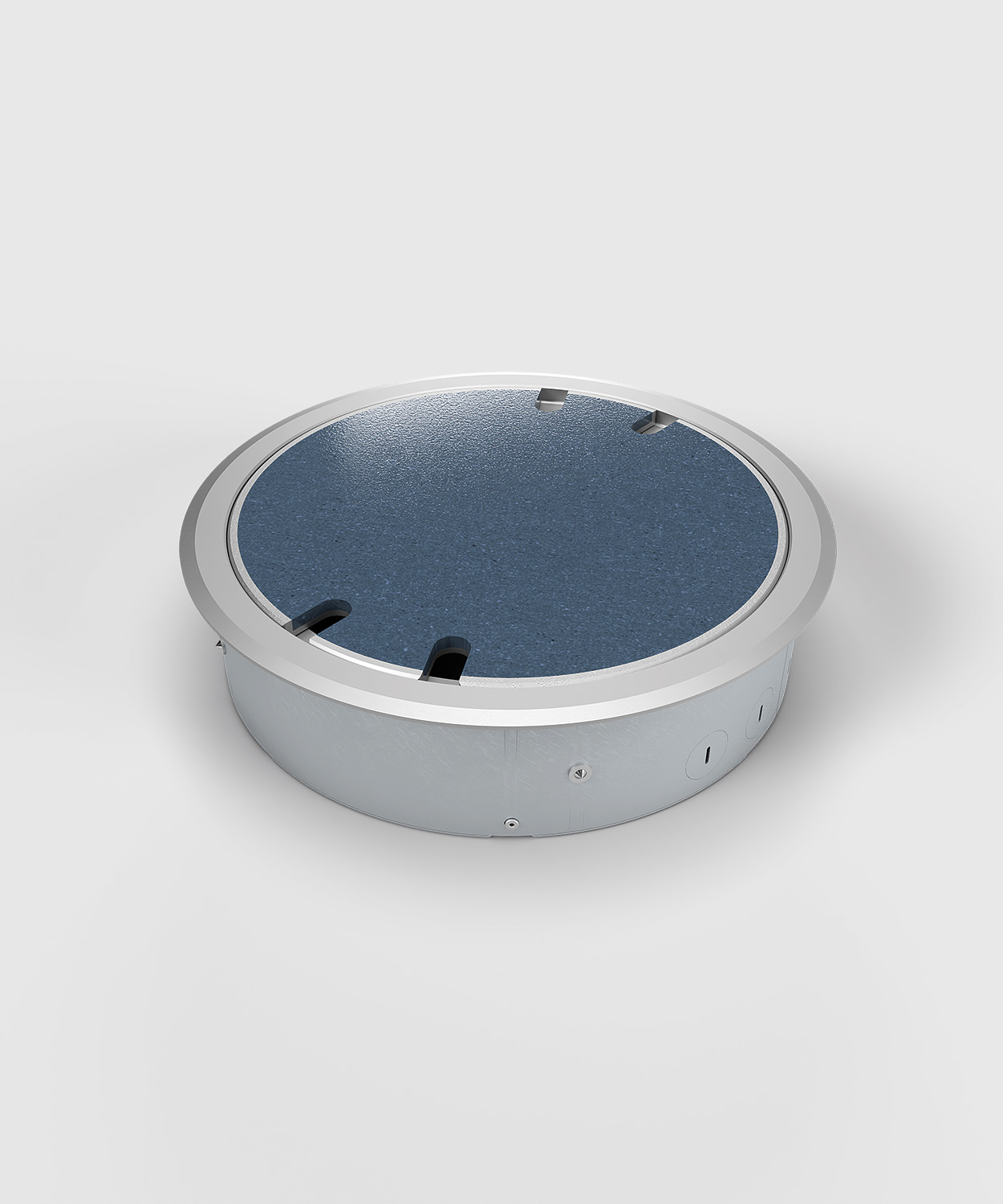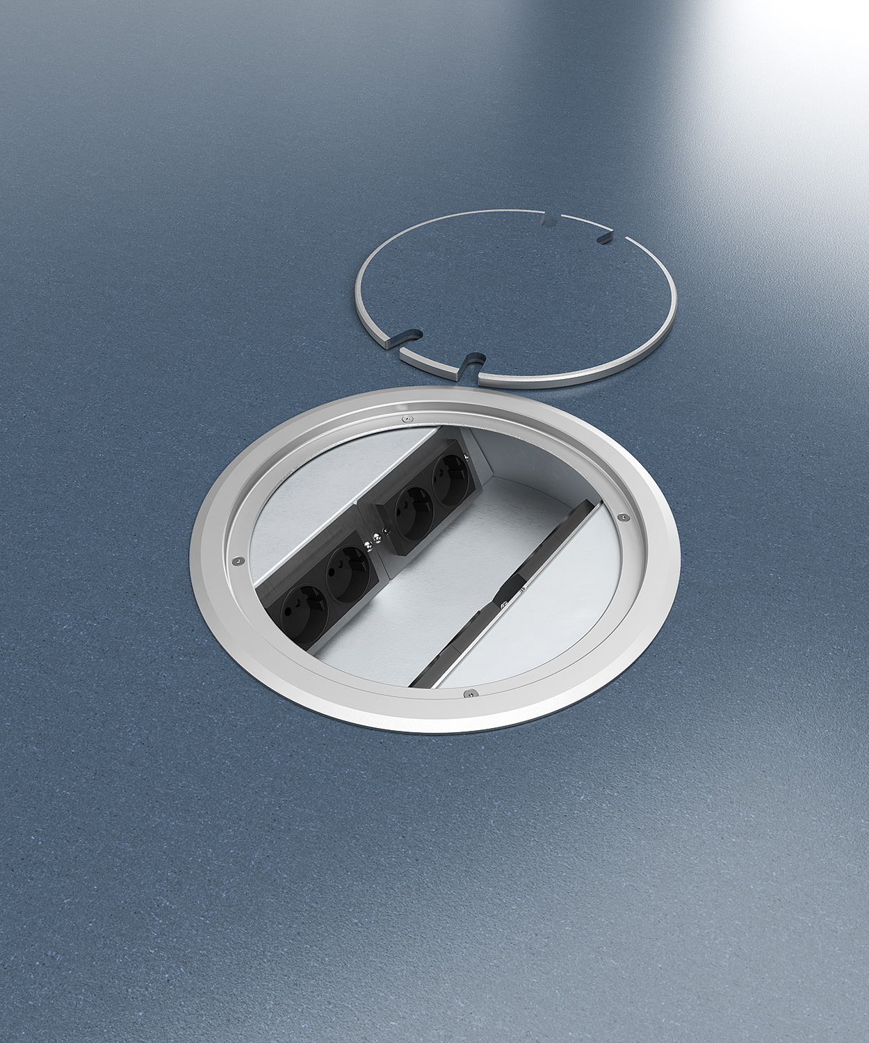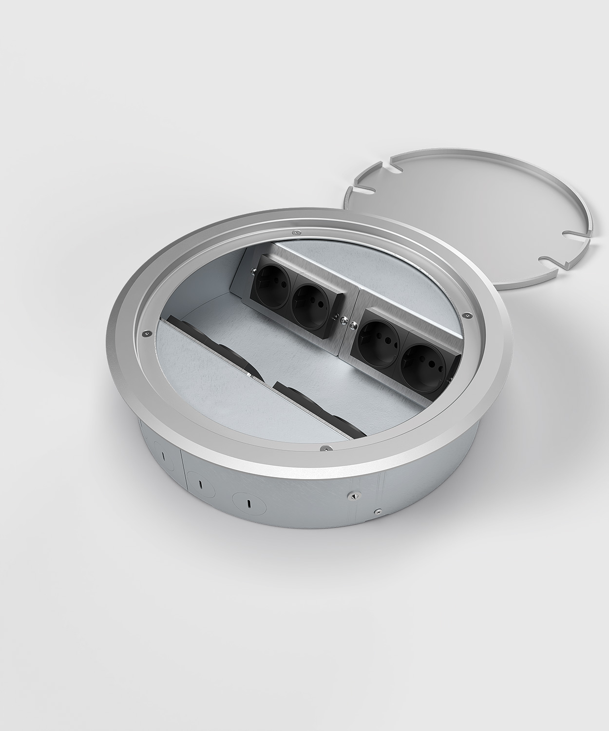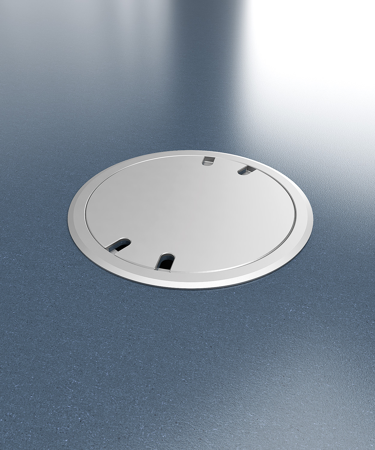Runder Hohlbodentank 9908A mit einem Gehäuse aus Edelstahl, Kranz und Deckel aus massivem Aluminium und einem Deckel zum Auflegen. Deckel schließt auch bei gestecktem Standardstecker in gerader oder abgewinkelter Form. Der Wendedeckel ist in Alu-Natur eloxiert oder mit Teppich etc. belegbar. Weitere Bestückungsvarianten auf Anfrage.