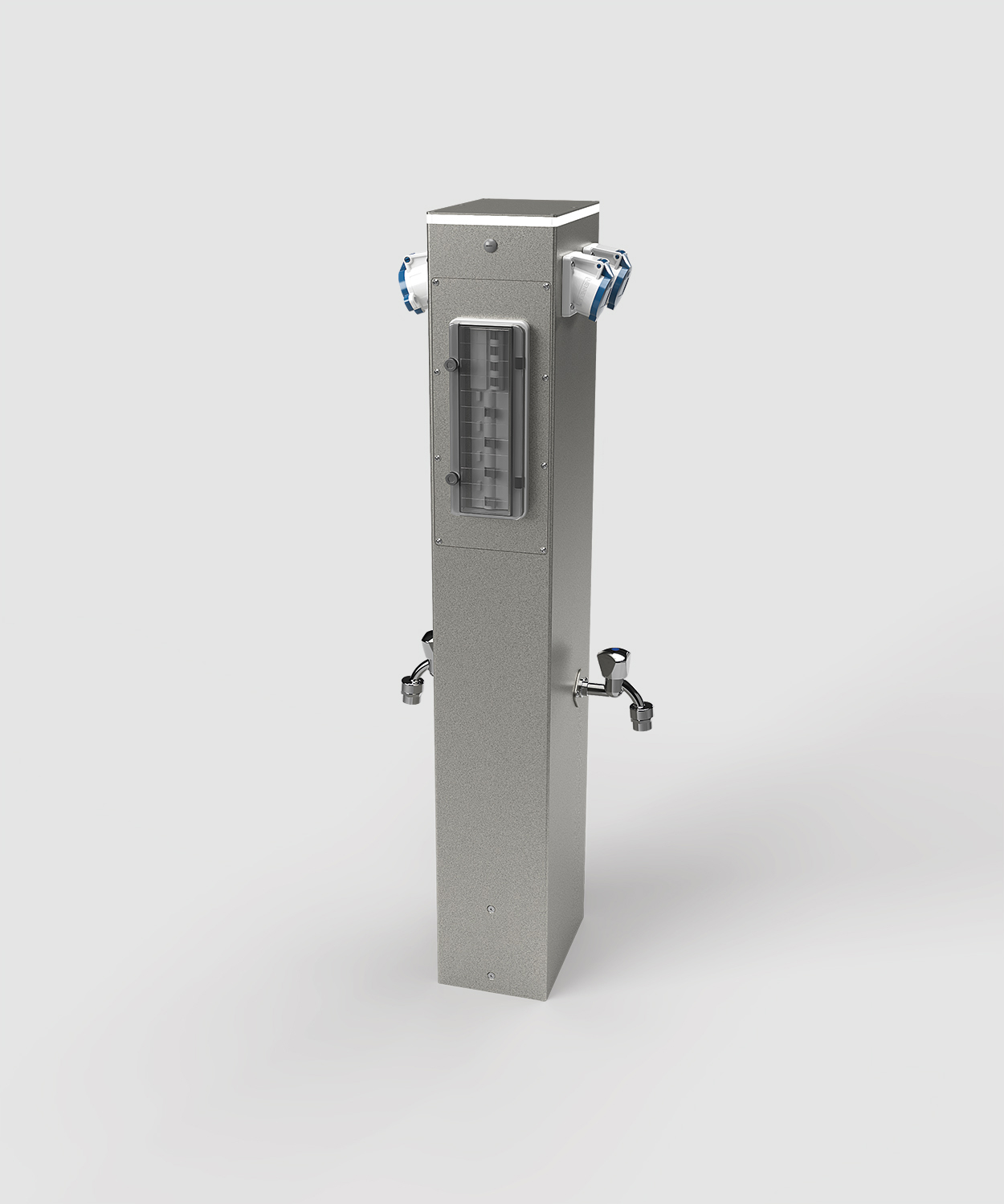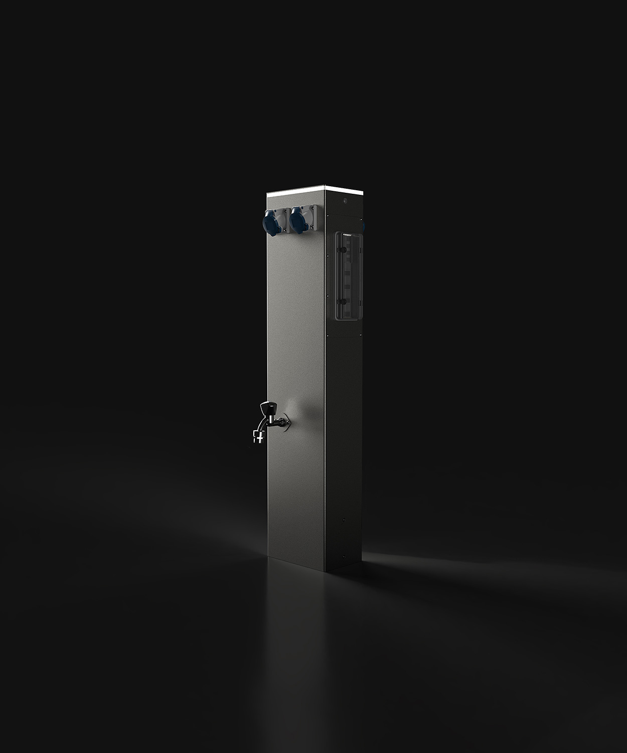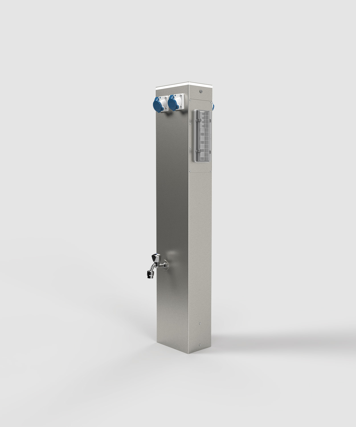 Bestückung: 4 x CEE 3/16A 230V/6h • 2 x Wasseranschluss • 1 x Lasttrennschalter 63A/400V, 4Pol