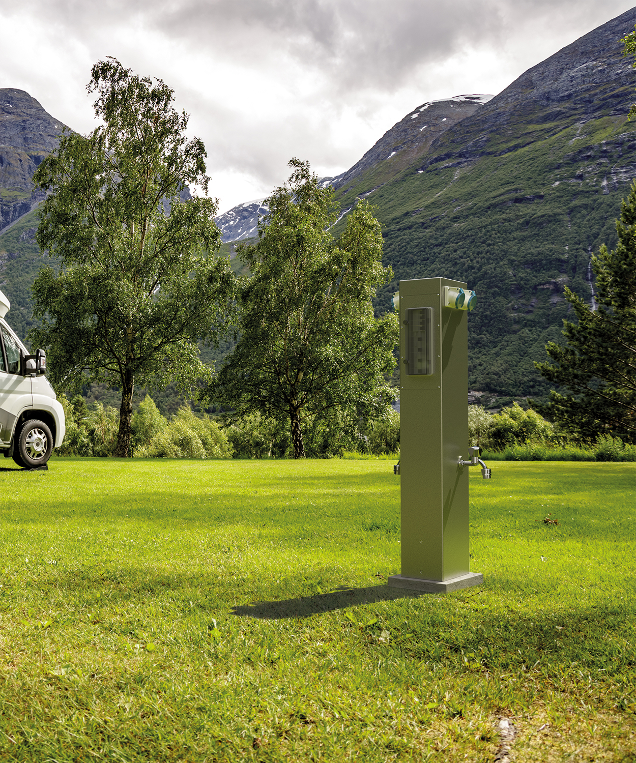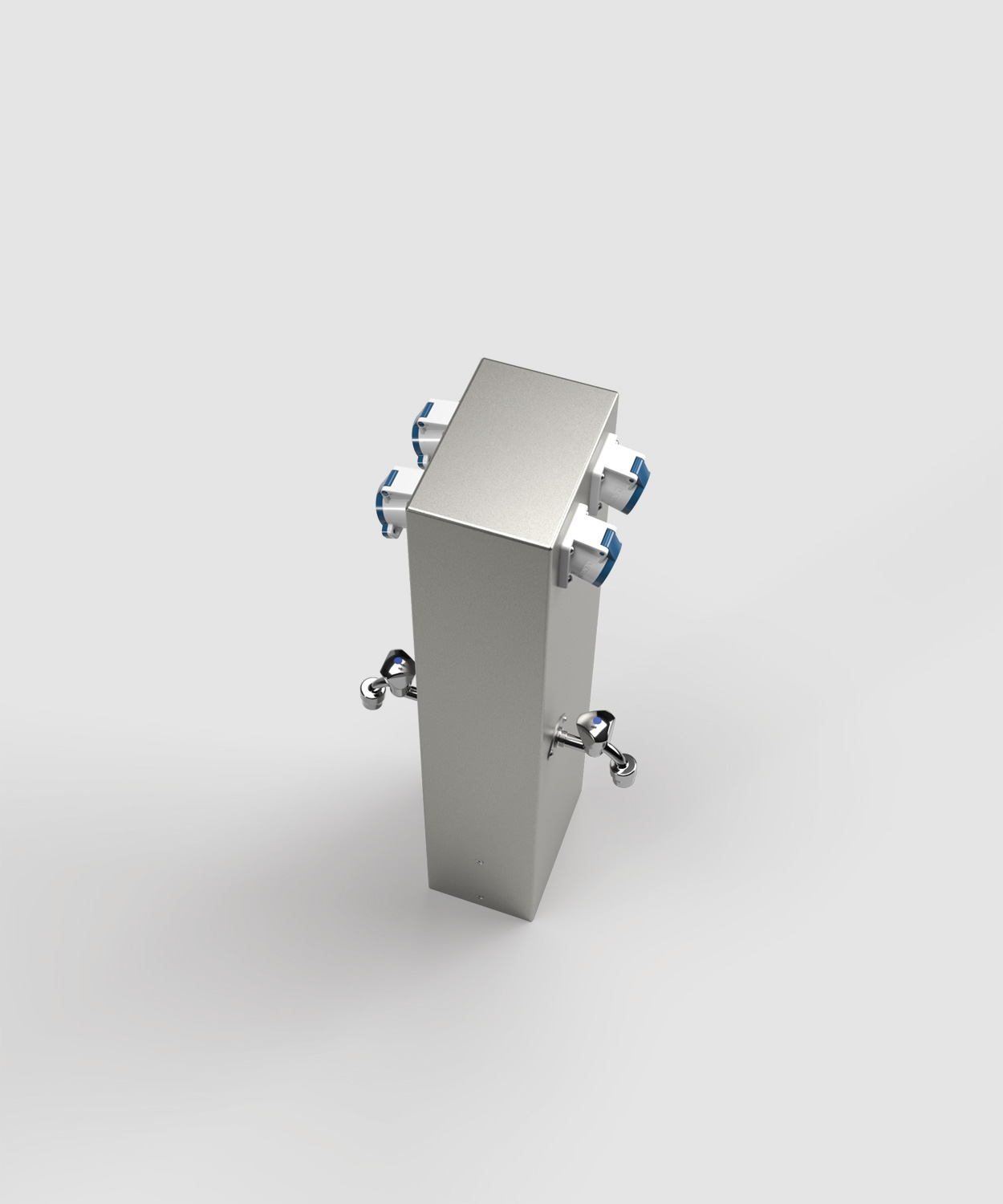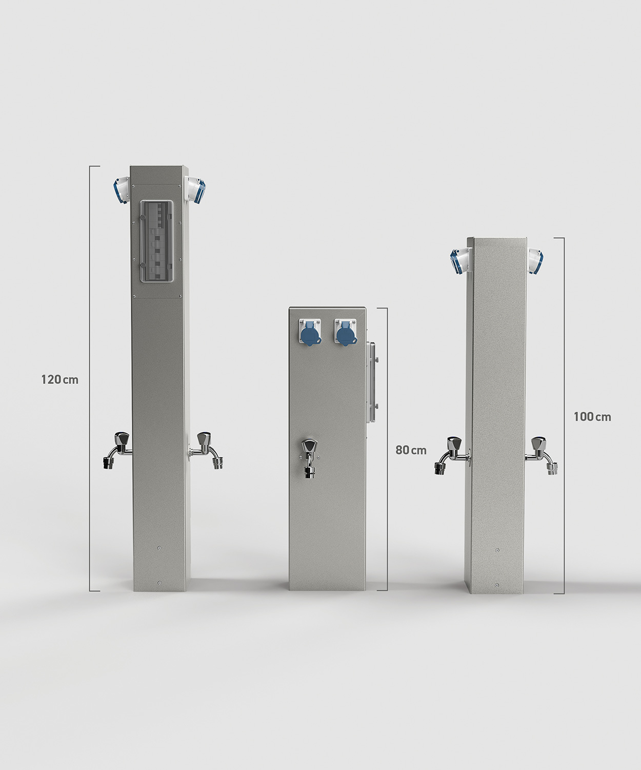 Bestückung: 4 x CEE 3/16A 230V/6h • 2 x Wasseranschluss • 1 x Lasttrennschalter 63A/400V, 4Pol